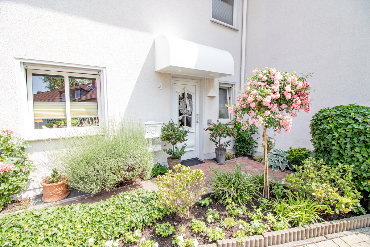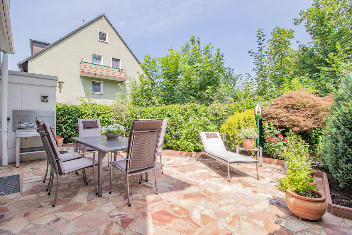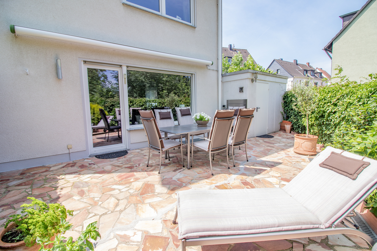 Durch die elektronisch steuerbare Markise kann man auf der Terrasse Sonnenschein sowie Schatten je nach Bedarf genießen. Die Steuerung erfolgt über die Garage.