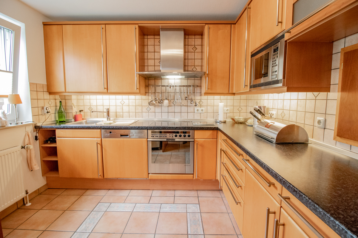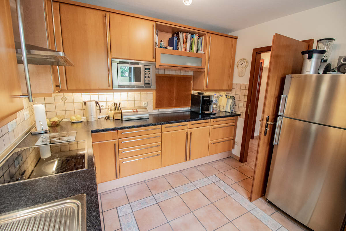Zunächst befindet sich auf der linken Seite neben dem Hauseingang die Küche, welche mit einer sehr hochwertigen Einbauküche, die im Kaufpreis mit enthalten ist, auf sich aufmerksam macht.