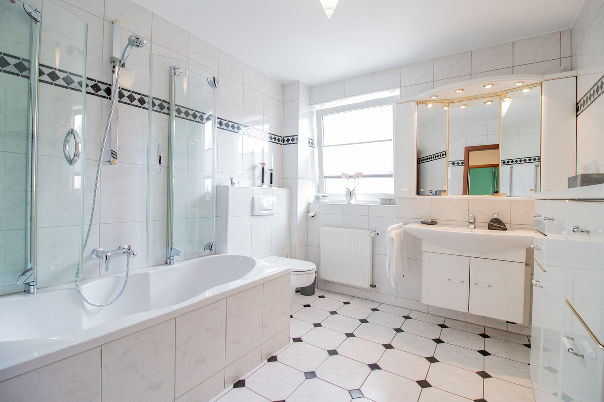 Im Obergeschoss befindet sich ein Tageslichtbadezimmer, welches mit einer Badewanne nebst darauf aufgebauter Duschkabine und hochwertigen Badezimmermöbeln auf sich aufmerksam macht.