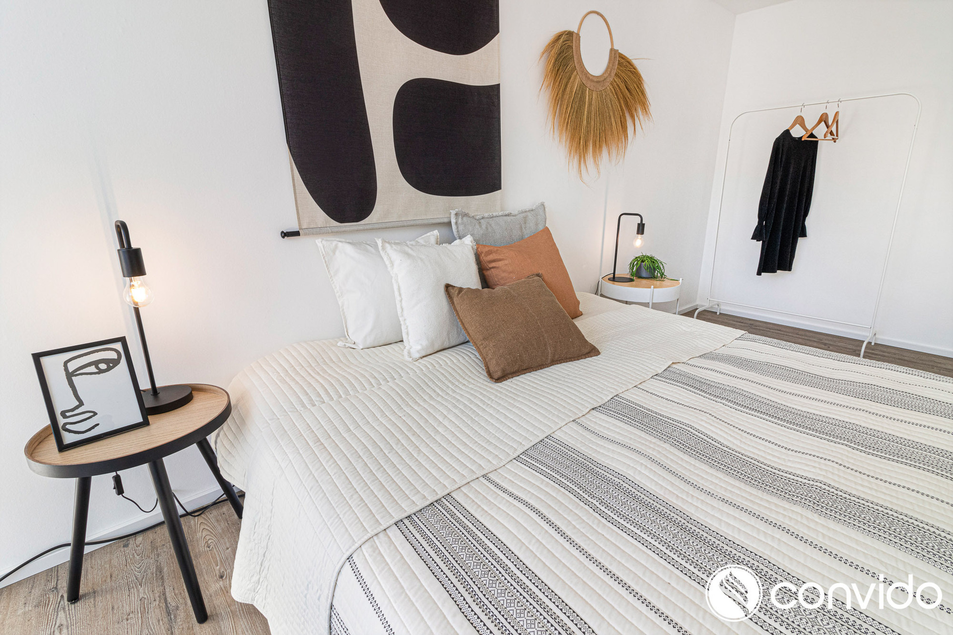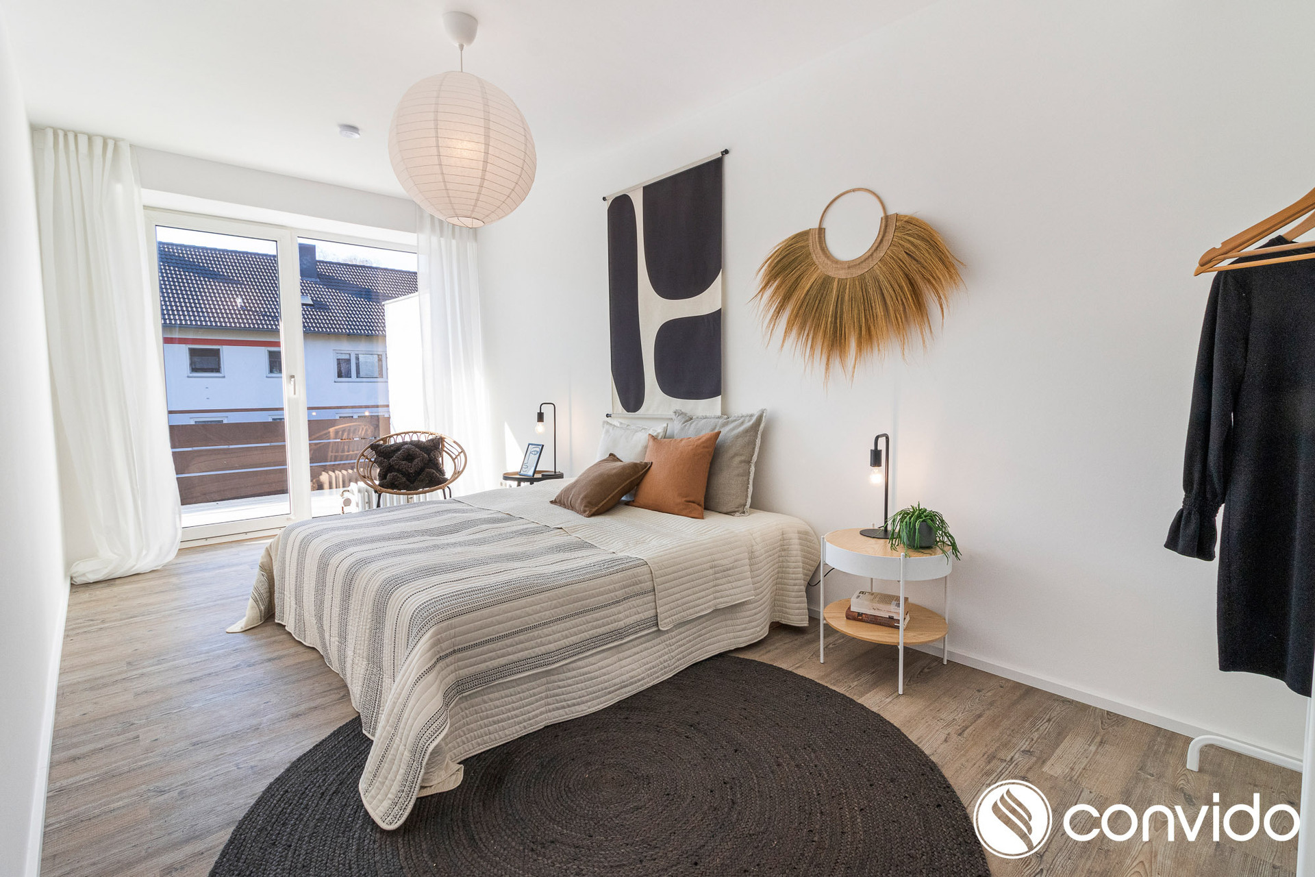 Auf der anderen Seite der Wohnung befinden sich das moderne Bad mit Wanne und Dusche sowie das Schlafzimmer. Dieses hat ebenfalls einen Balkon, der bei schönem Wetter zum Entspannen an der frischen Luft einlädt. In allen Wohnräumen liegt hochwertiger neuer Vinylboden in zeitloser Optik.