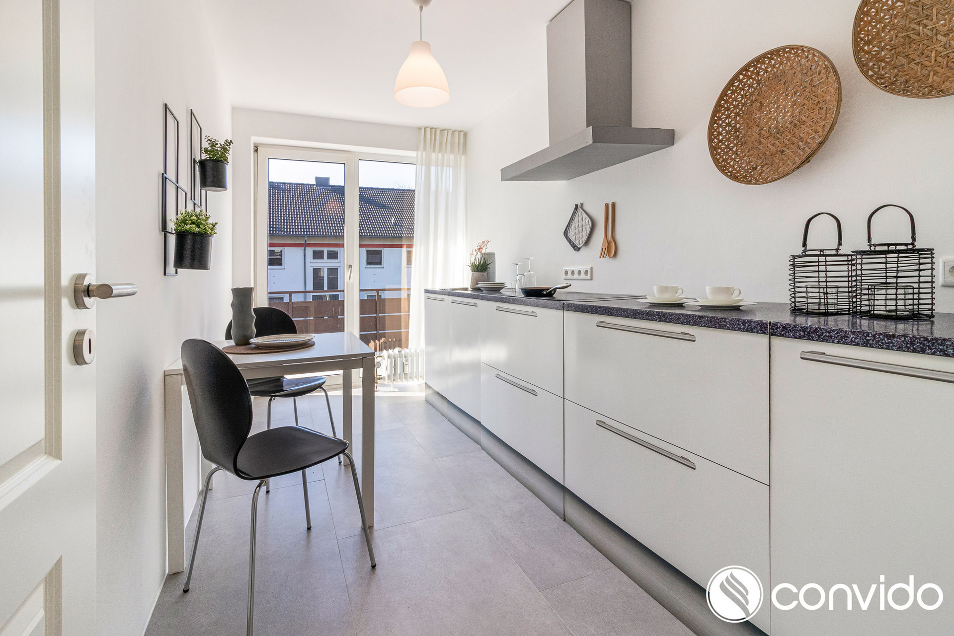 Das großzügig geschnittene Wohnzimmer bietet ausreichend Platz für die Gestaltung als kombinierter Wohn-Essbereich. Nebenan befindet sich die separate Küche. Ein weiterer Raum lässt sich als Kinderzimmer gestalten. Jeder dieser drei Räume besitzt einen Zugang zum großen Balkon, der attraktive Rückzugsmöglichkeiten unter freiem Himmel eröffnet.