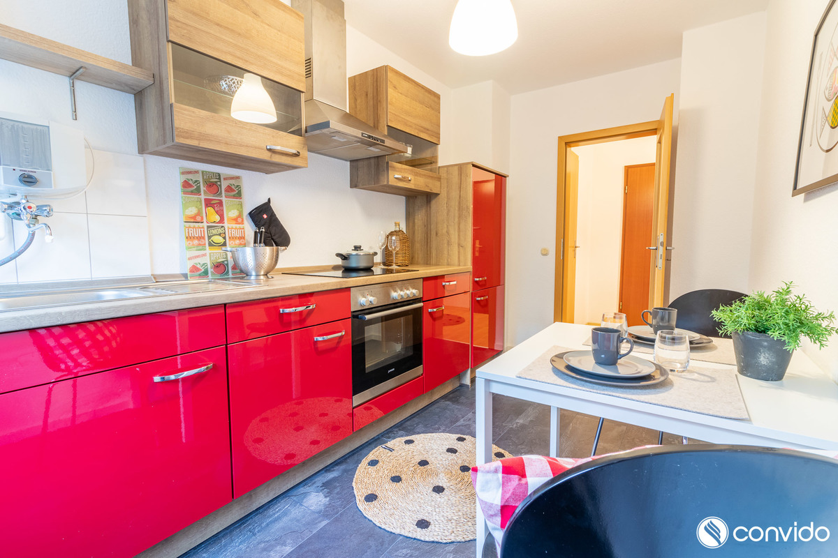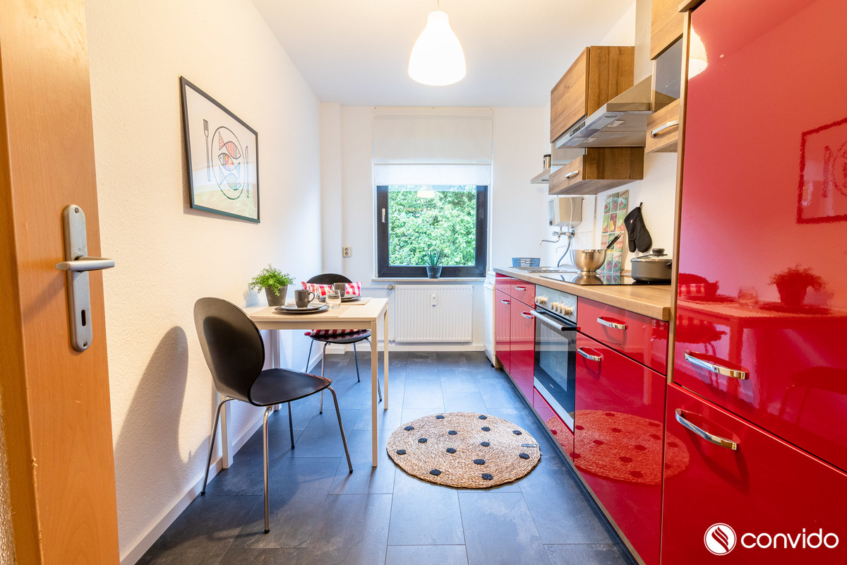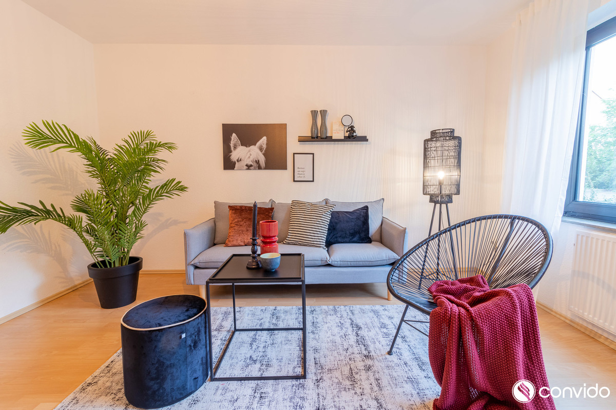 Gleiches lässt sich auf die offerierte Wohnung übertragen. Erst im Jahr 2017 wurde u. a. das Badezimmer vollständig modernisiert. Nach einem breiten Flur im Eingangsbereich erstrecken sich auf einer Wohnfläche von rund 56 m² eine Küche, ein Badezimmer mit Glaskabinendusche, eine Abstellkammer, ein gemütlicher Wohnraum sowie ein Schlafzimmer. Ausreichend Abstellfläche hält ein Kellerabteil im Untergeschoss bereit. Dank geschickt platzierter Fensterfronten zeichnet sich die Wohnung durch ein helles Ambiente aus. Während in den Wohnräumen ein hochwertiger Laminatboden Behaglichkeit generiert, ist die Küche mit einem praktischen Vinylboden in Anthrazit ausgestattet. Im Kaufpreis ist eine moderne Küchenzeile inbegriffen. Die Kombination aus roter Verkleidung und der Arbeitsplatte aus Holz kreiert auch ein optisches Highlight.