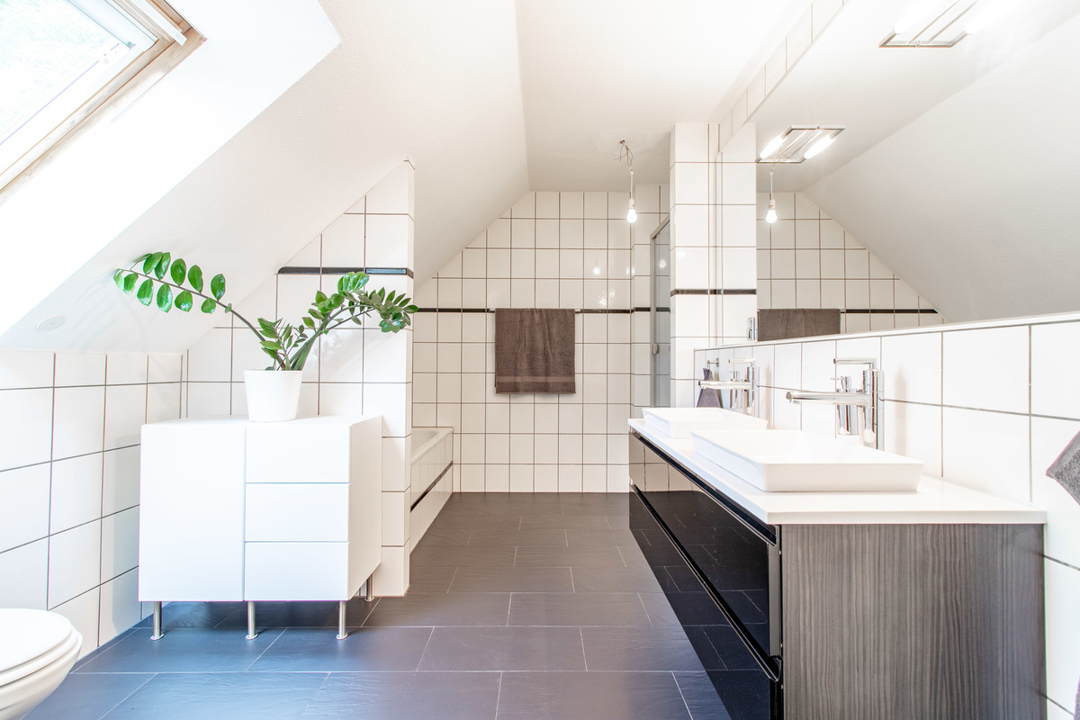 Das Badezimmer weist mit einer Badewanne, welche mit einer sehr hochwertigen Armatur ausgestattet ist, einer Dusche, einem Doppelwaschtisch, einem großen Spiegel, einem großen Dachflächenfenster und seinem tollen Fliesenboden in Schieferoptik sowie seiner schönen, deckenhohen Befliesung weitere Highlights dieser Immobilie auf.