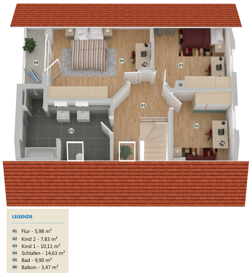 Im Obergeschoss befinden sich ein Schlafzimmer mit Balkon, ein Kinderzimmer und ein Arbeitszimmer sowie das Hauptbadezimmer.