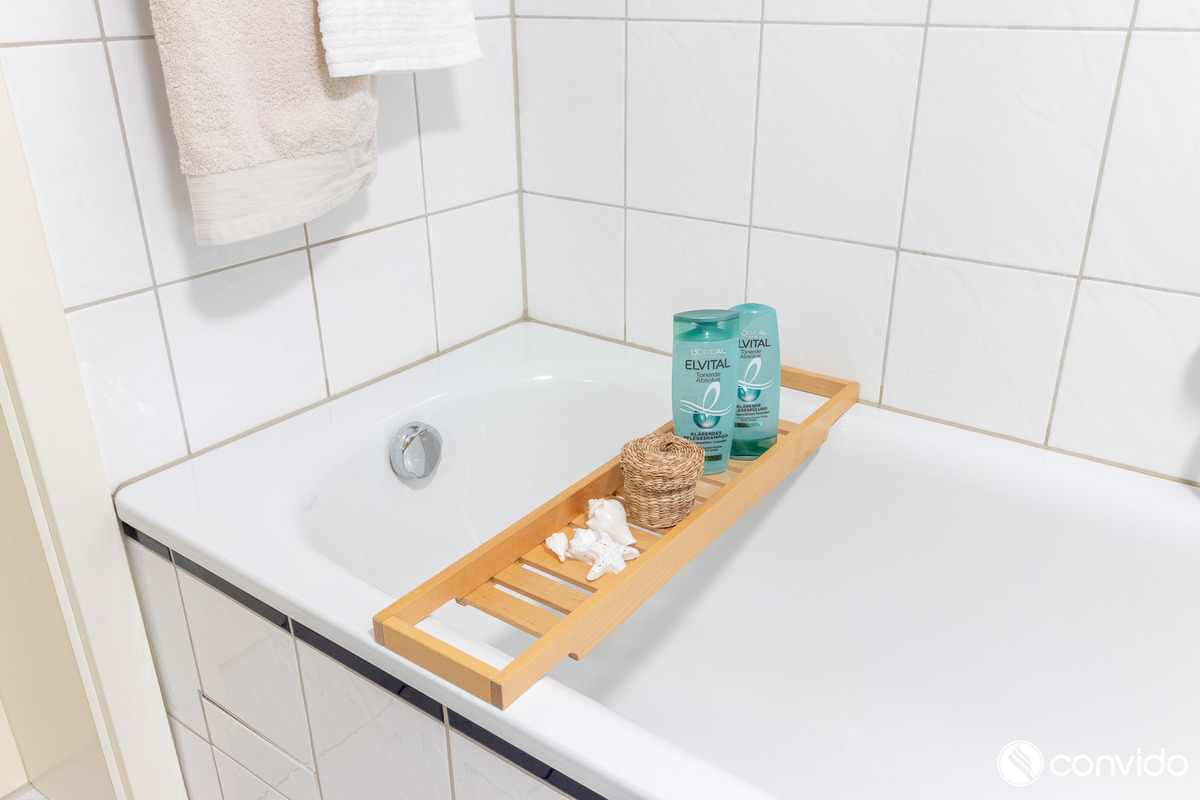Das Badezimmer kann sowohl über den Flur, als auch über das Schlafzimmer betreten werden. Es verfügt über eine Dusche mit Glaskabine, eine Badewanne, ein WC sowie einen Waschtisch. Der Anschluss für Waschmaschine und Trockner ist in einem kleinen, separierten Abstellraum zu finden.