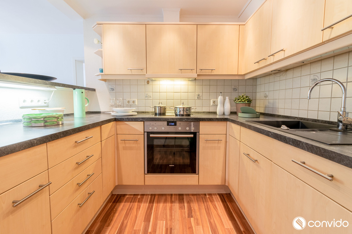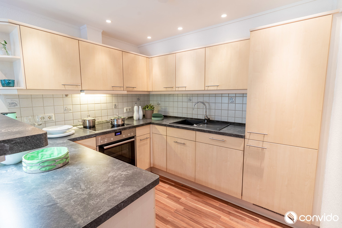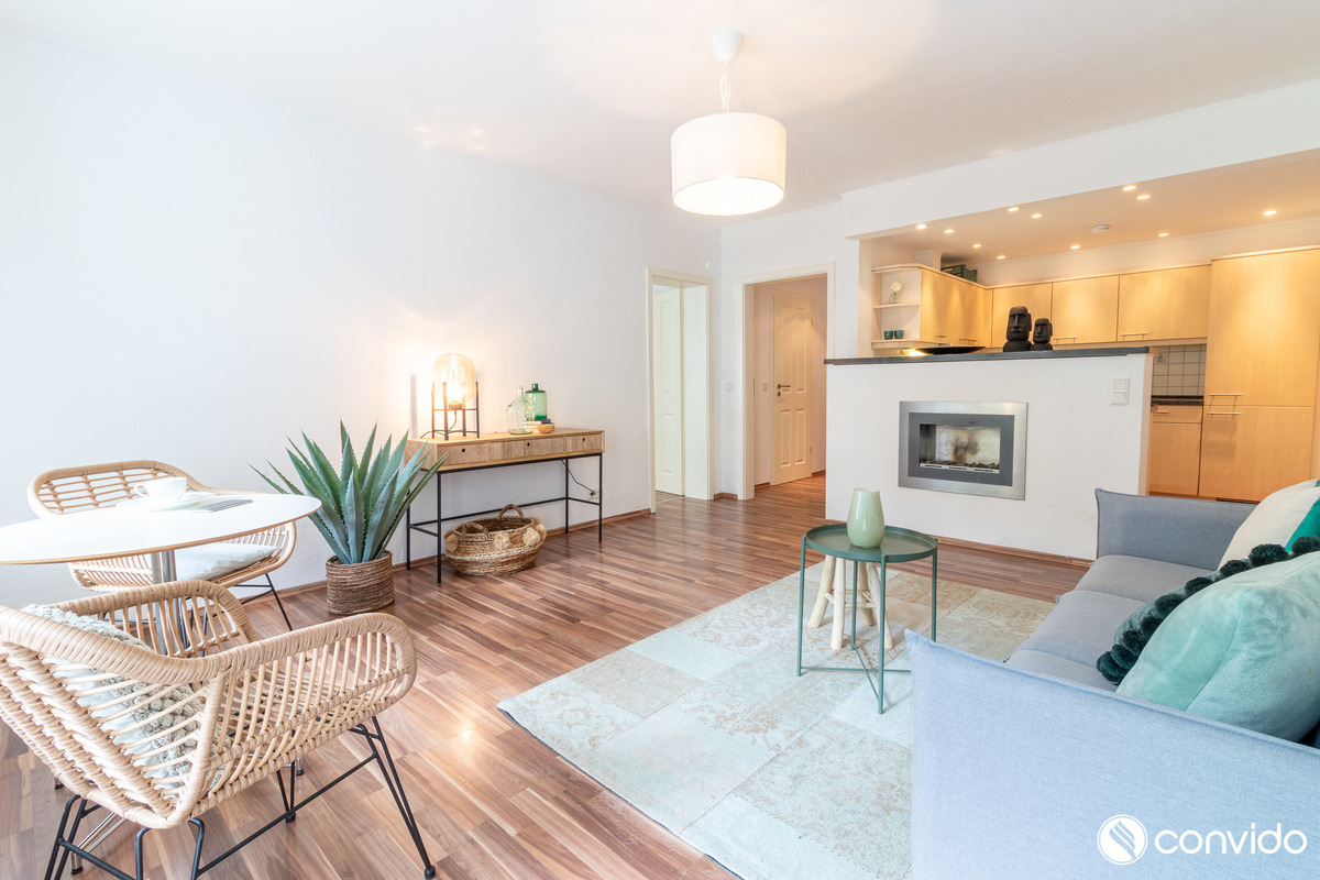 Hinter dem Eingangsbereich erstrecken sich auf einer Wohnfläche von ca. 70 m² ein Bad, ein großzügiger Wohnraum mit offener Küche sowie ein Schlafzimmer. Dank der gelungenen Aufteilung und geschickt platzierter Fensterfronten zeichnet sich das Appartement trotz des Tiefparterres durch großartige Lichtverhältnisse aus. Die notwendige Behaglichkeit im Wohnungsinneren wird durch einen eleganten Laminatboden in Holzoptik generiert. In Kombination mit klassisch weißen Wänden und dem sonnigen Flair wurde ein einladender Lebensmittelpunkt geschaffen. Entspanntes Kochvergnügen ermöglicht die moderne Einbauküche mit Einbaugeräten von Siemens. Das Farbschema aus der hellen Holzverkleidung und dem dunklen Anthrazitton der Arbeitsplatte wirkt zeitlos und fügt sich harmonisch in den Raum ein. Als Besonderheit ist aufseiten des Wohnzimmers ein Ethanol-Kamin in den Küchentresen eingelassen.