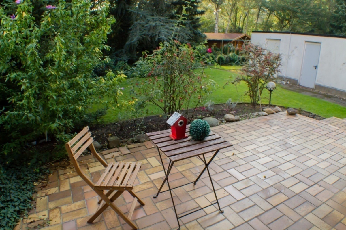 Ein schöner Garten mit Terrasse läd zum verweilen ein. Neben dem Haus befindet sich eine Garage, die beim Kauf des Hauses mit erworben wird.