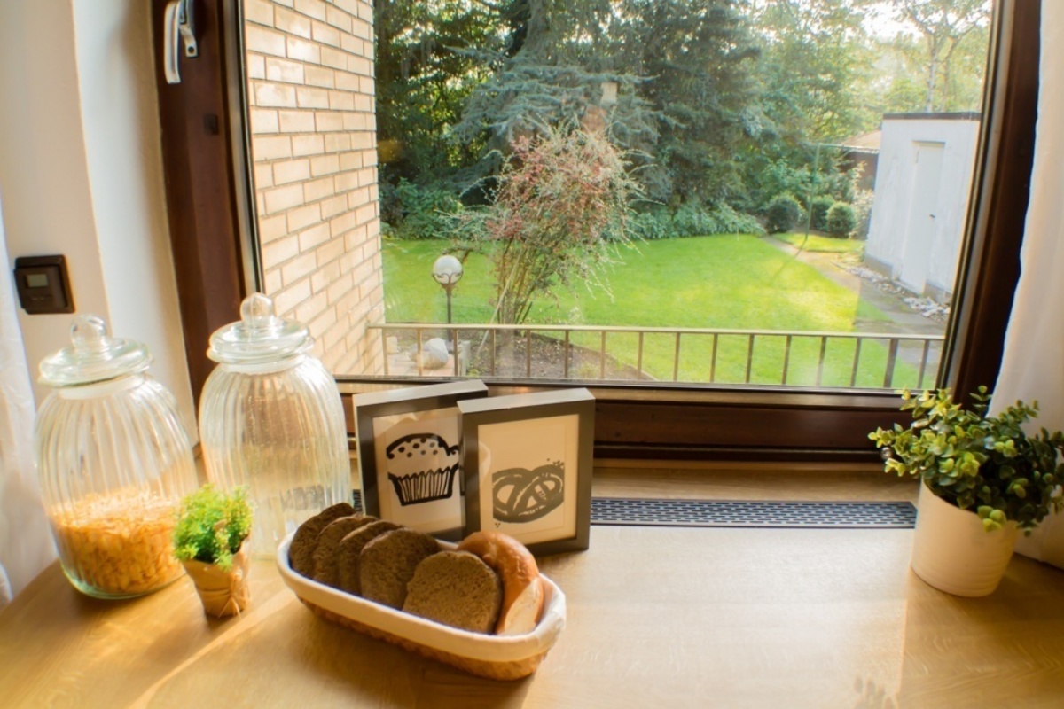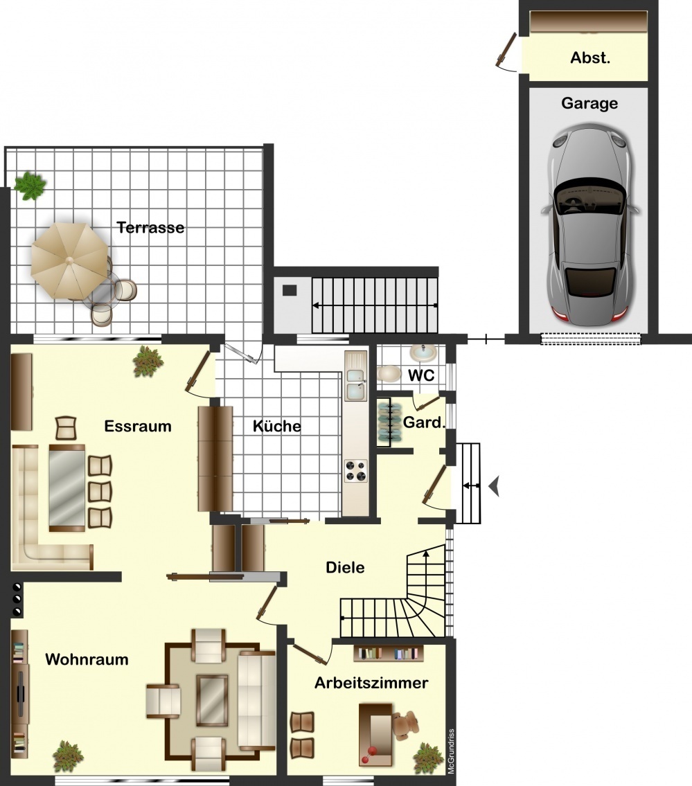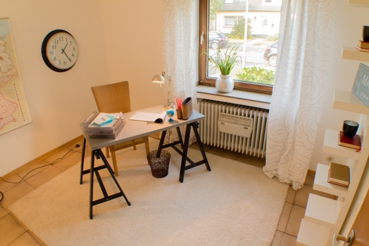 Im ca. 85 m² großen Erdgeschoss befindet sich der großzügige Wohn- Essbereich, die gemütliche Küche, ein Arbeitszimmer, eine Abstellkammer, das Gäste-WC, sowie die Diele/ Treppenhaus und der Windfang, welcher als Garderobe genutzt werden kann.