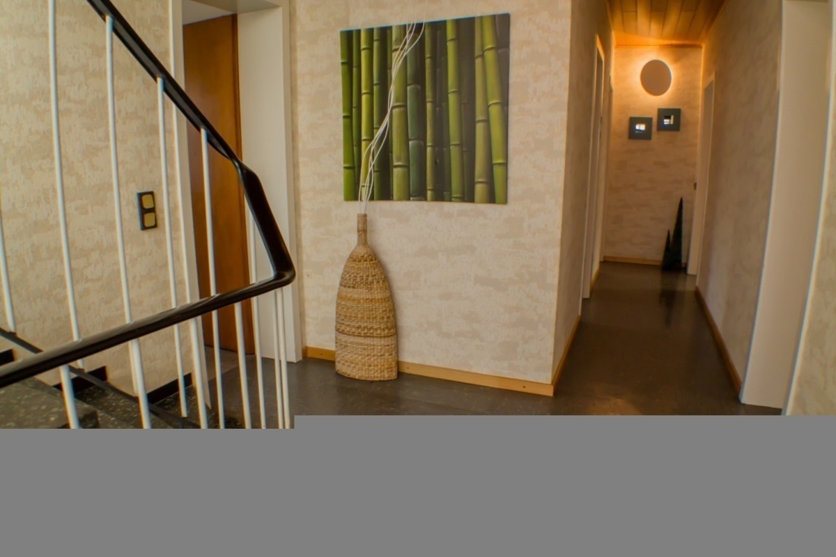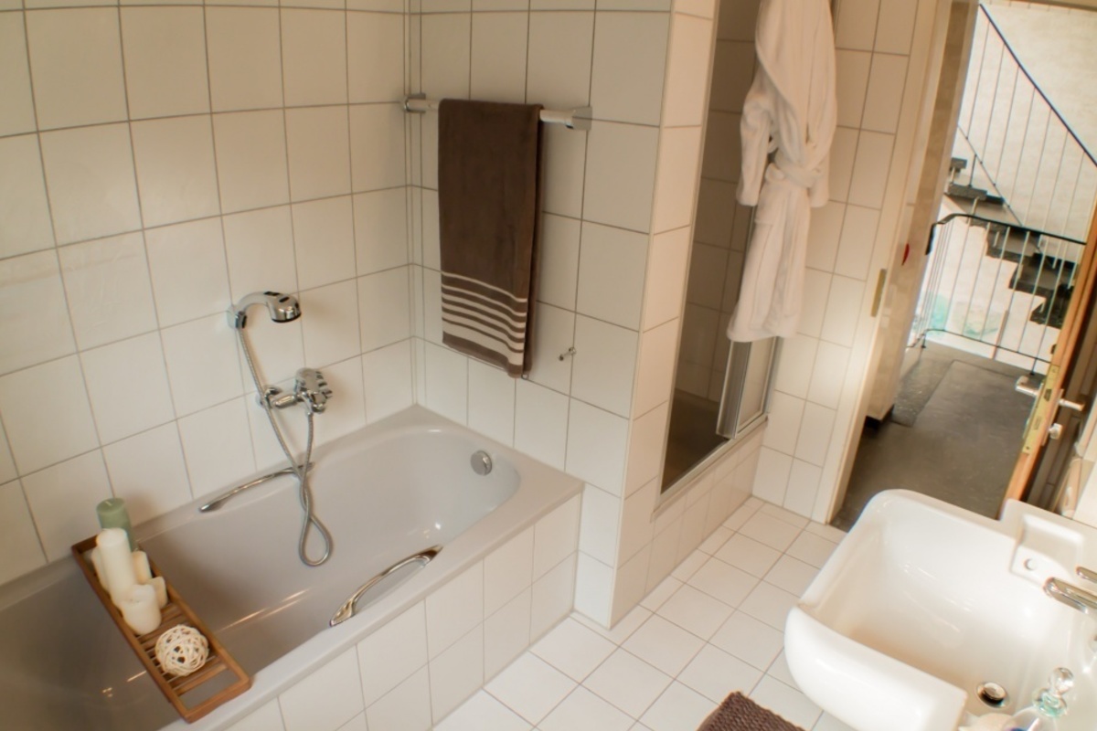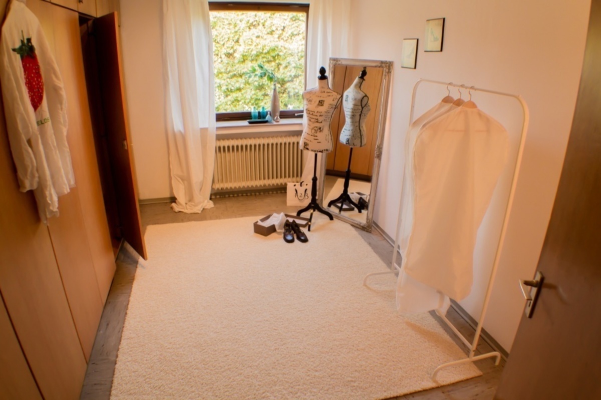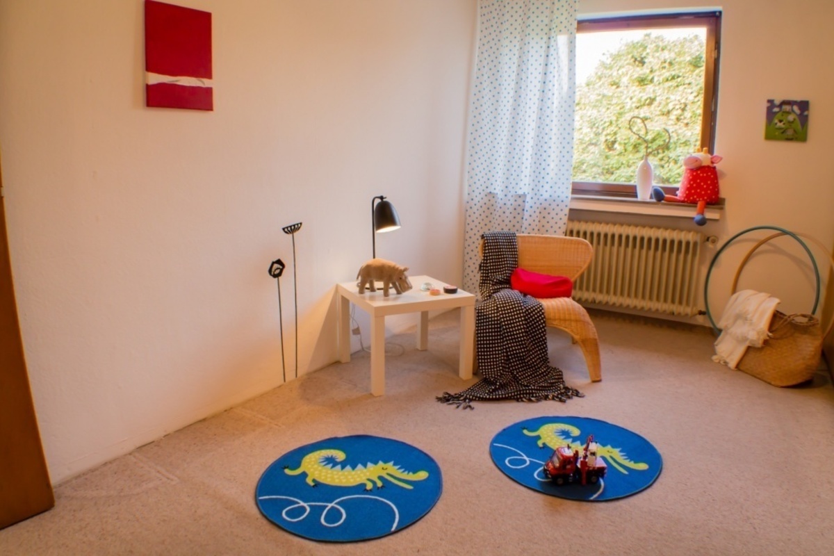 Das Obergeschoss erstreckt sich über rund 86 m². Von der Treppe erreicht man durch den Flur insgesamt 4 Schlafräume, ein weiteres Arbeitszimmer, eine Abstellkammer, das gemütliche Bad sowie den Balkon mit Blick ins Grüne.