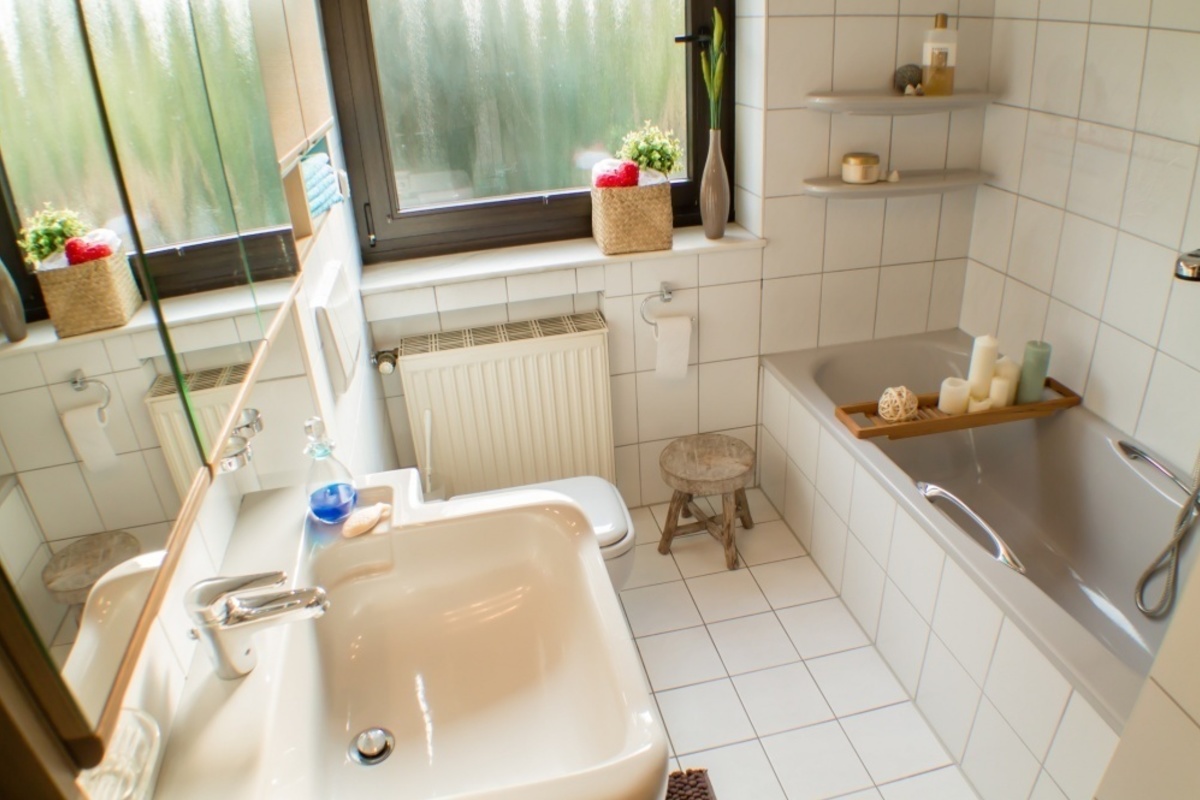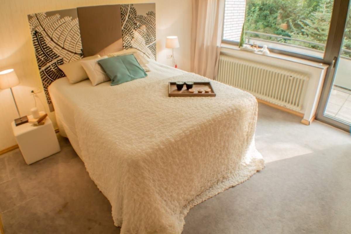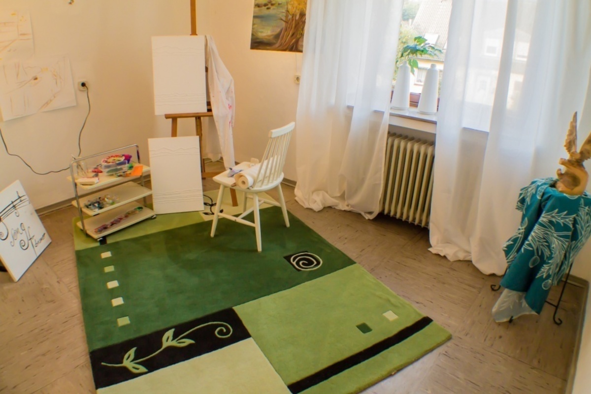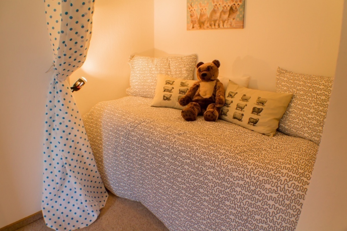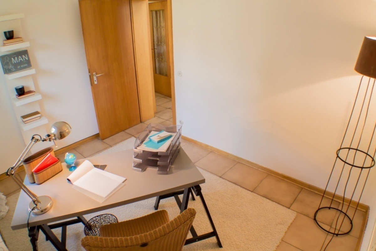 Das Obergeschoss erstreckt sich über rund 86 m². Von der Treppe erreicht man durch den Flur insgesamt 4 Schlafräume, ein weiteres Arbeitszimmer, eine Abstellkammer, das gemütliche Bad sowie den Balkon mit Blick ins Grüne.