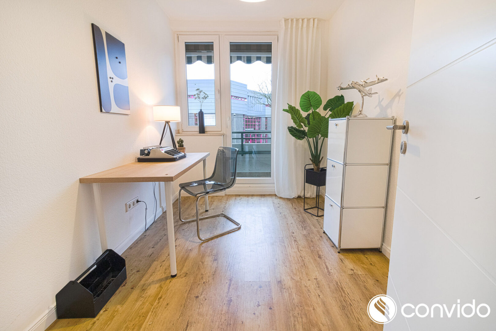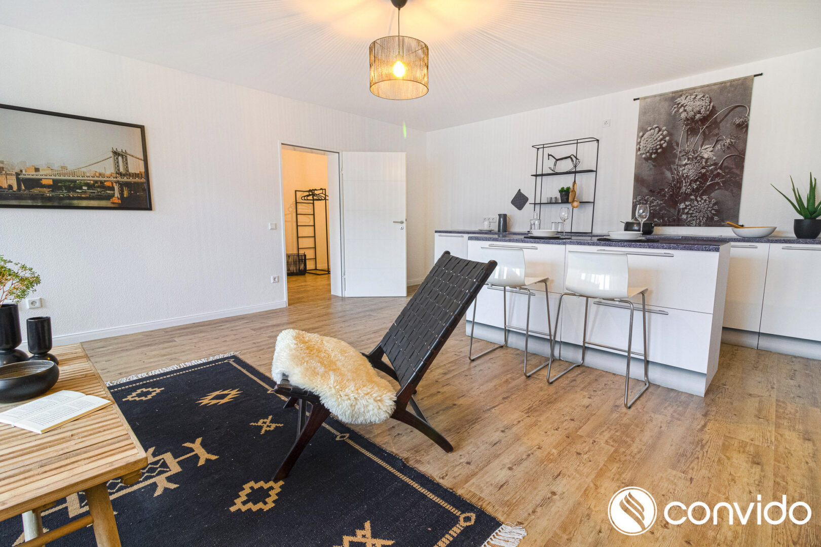 Ein Raum rechts vom Eingangsbereich eignet sich hervorragend als Arbeitszimmer. Links finden Sie das kleinere der beiden Schlafzimmer, das ideal als Hobby- oder Kinderzimmer genutzt werden kann. Der Wohn-Essbereich mit offener Küche und Kochinsel bietet Ihnen viel Platz zum Entspannen und Wohlfühlen.