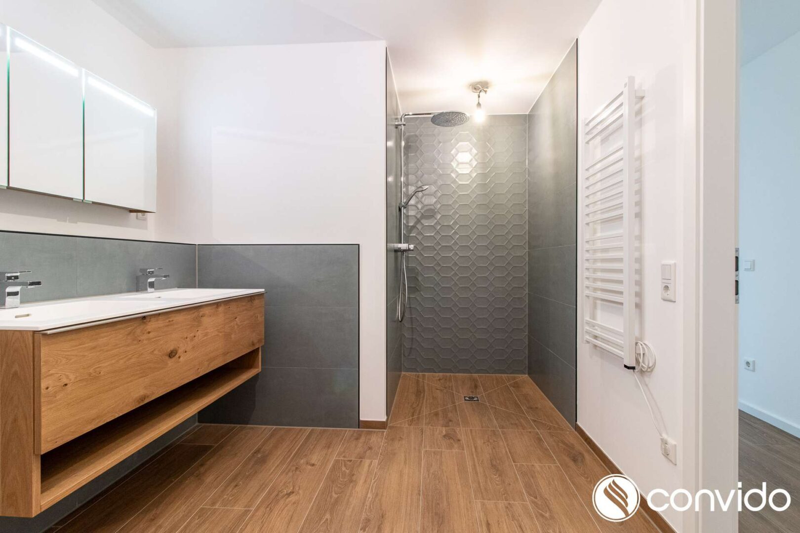 Das großzügige Badezimmer lädt mit seiner stilvollen Ausstattung und der eleganten Gestaltung zum Entspannen ein