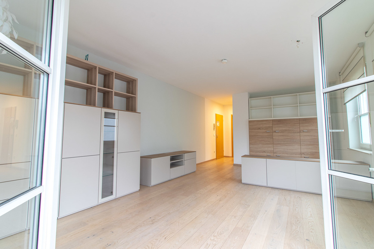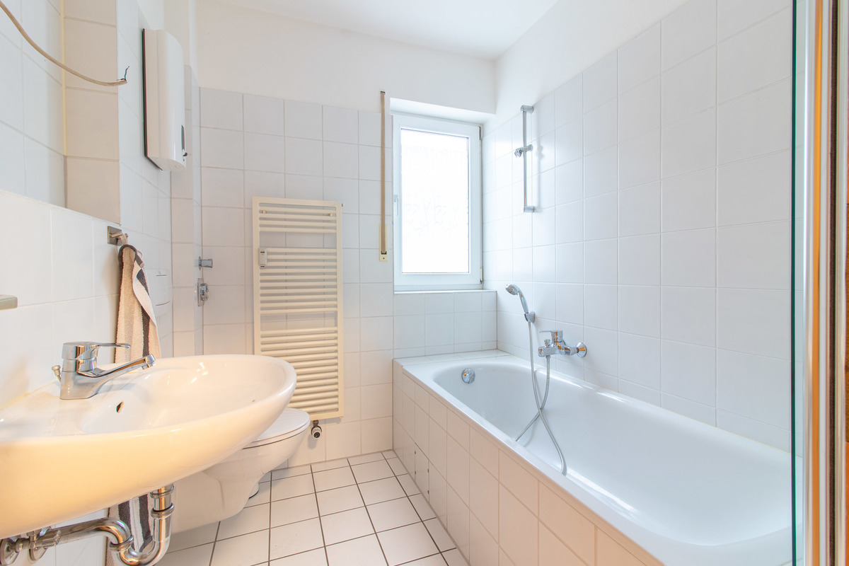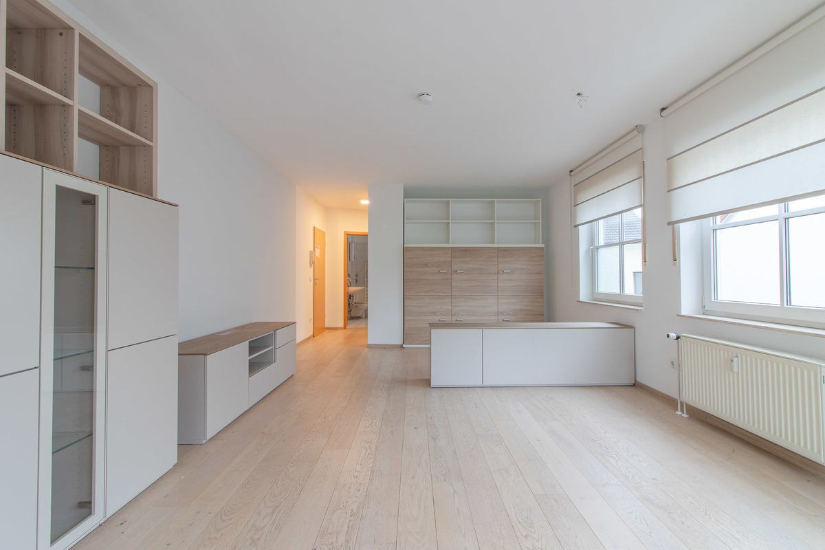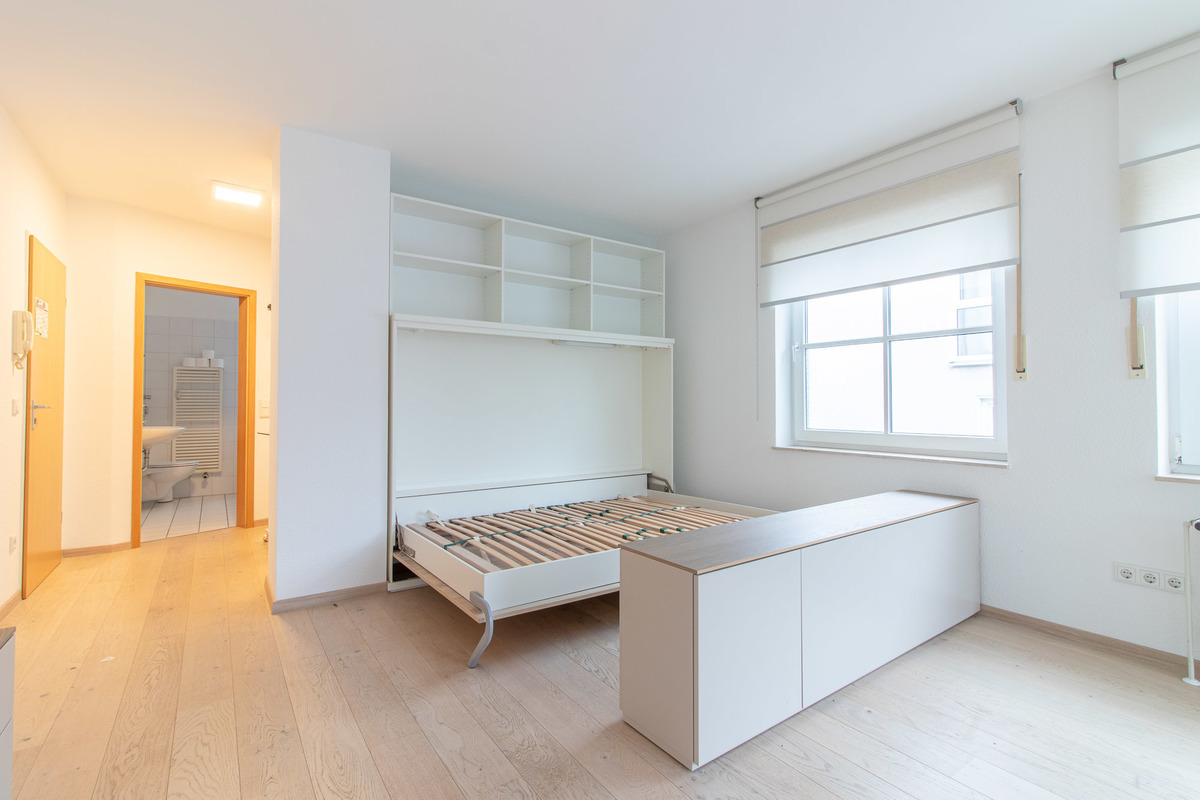 Über den Flur gelangen Sie in das helle Wohn-/Schlafzimmer und die separate Küche. Der Wohn-/Schlafzimmer ist mit hochwertigen Möbel ausgestattet, wie z.B. einem Schrankbett (optional erhältlich). Aus diesem Raum können Sie auch den großzügigen Balkon betreten, der zum Verweilen einlädt. Das Tageslicht-Badezimmer ist hell gefliest und mit einer Badewanne ausgestattet.