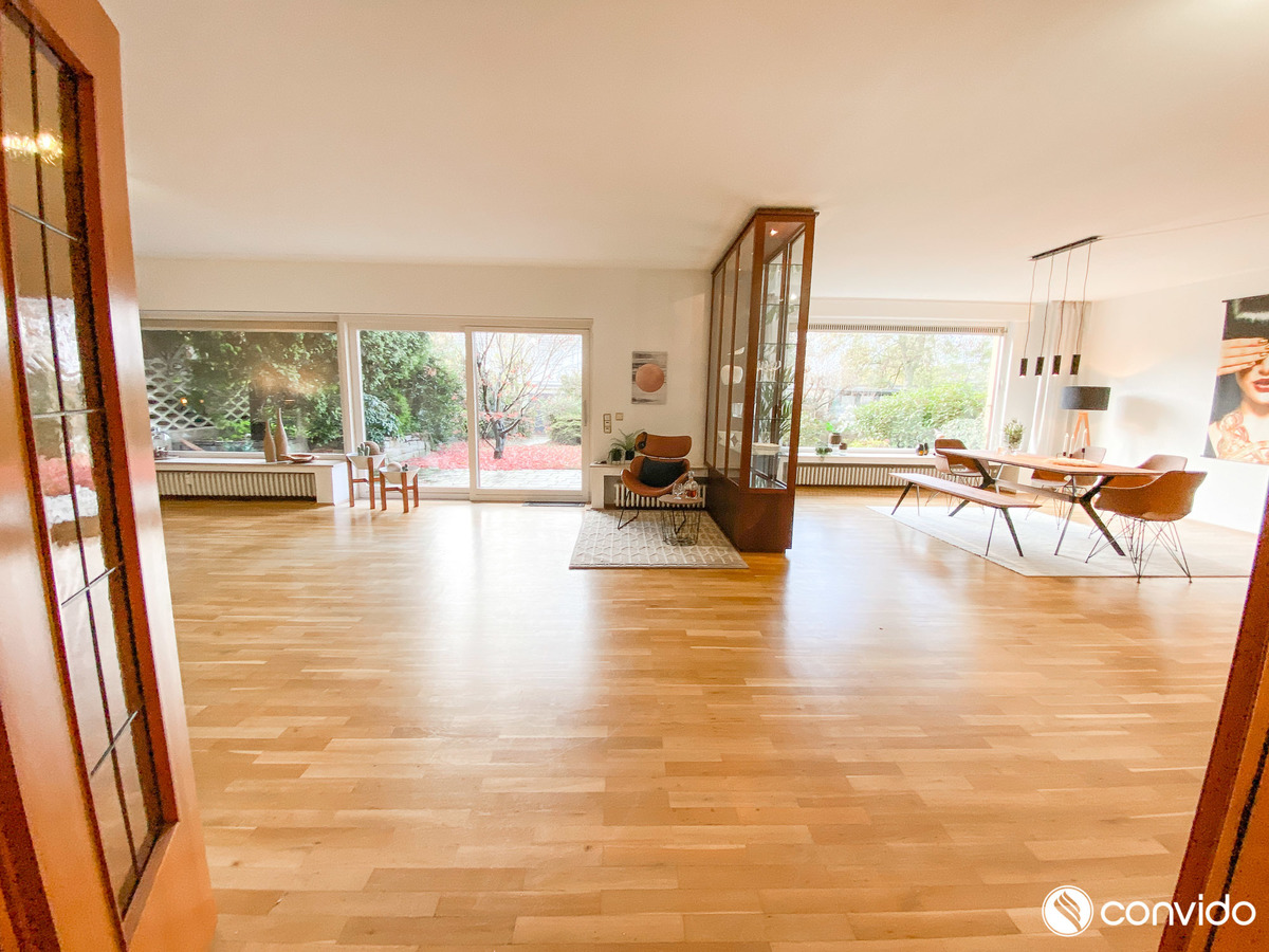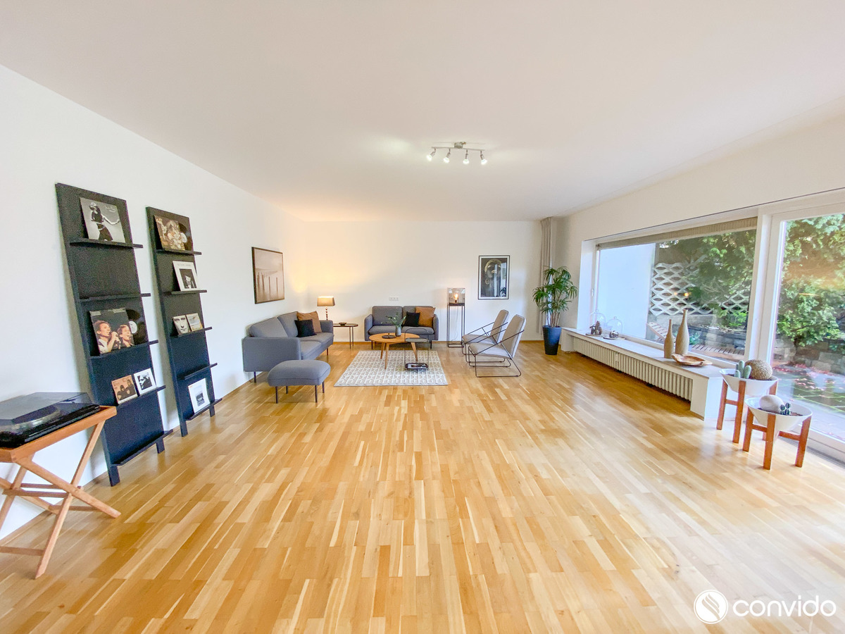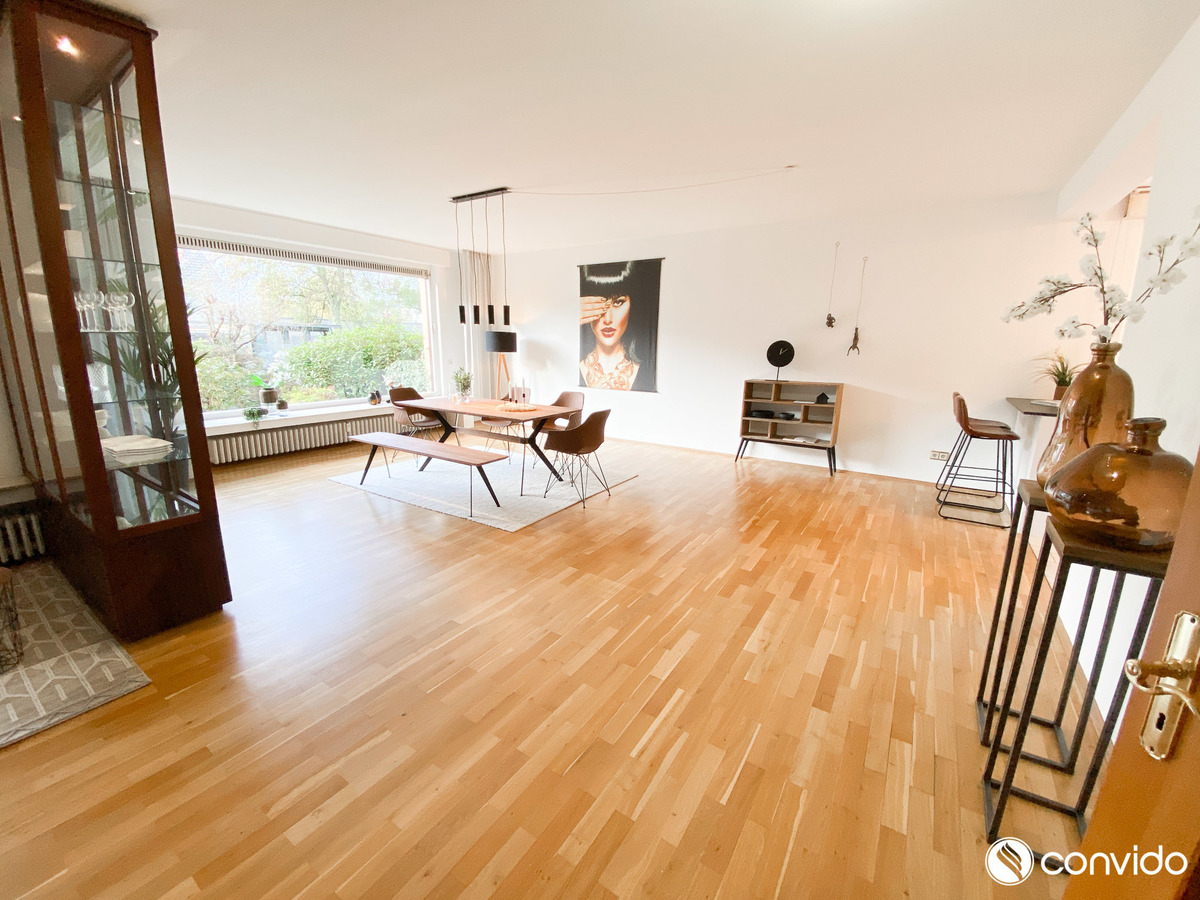 Die 4-Zimmer-Maisonette-Wohnung auf einer Fläche von ca. 160 m² ist ein Sinnbild der Behaglichkeit. Durch eine außergewöhnliche offene Konzeption, den wohldurchdachten Grundriss und die hochwertige Ausstattung bringt sie den Begriff Wohlfühlambiente auf eine völlig neue Ebene. Als kommunikativer Mittelpunkt des Appartements hebt sich das breite Wohn-/Esszimmer mit angrenzender Küche hervor. Große Fensterfronten und der Terrassenzugang versprechen optimale Lichtverhältnisse, während der harmonische Parkettboden ein gemütliches Ambiente generiert. An schönen Tagen lädt der idyllische Außenbereich mit Blick auf den Garten zu erholsamen Stunden im Freien ein. Neben zwei Tageslichtbädern auf jeder Wohnetage hält das Untergeschoss mit einem eigenen Pool sowie einer Sauna weitere Wellness-Highlights bereit. Zusätzlich zu klassischen Abstellflächen und einer Waschküche findet sich hier auch ein Partykeller inklusive Bar.