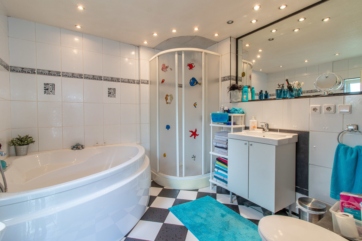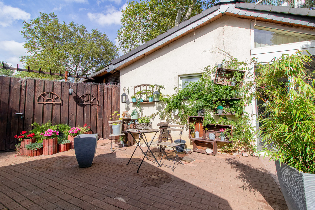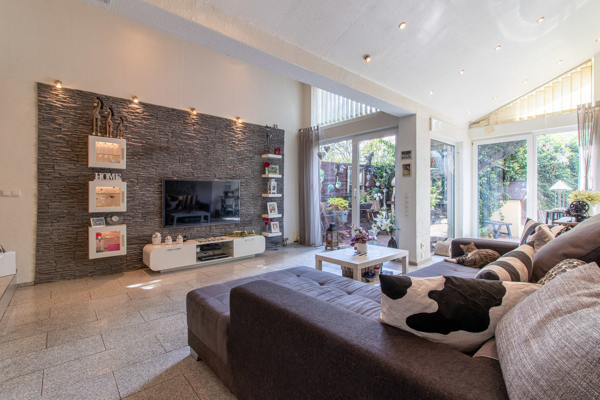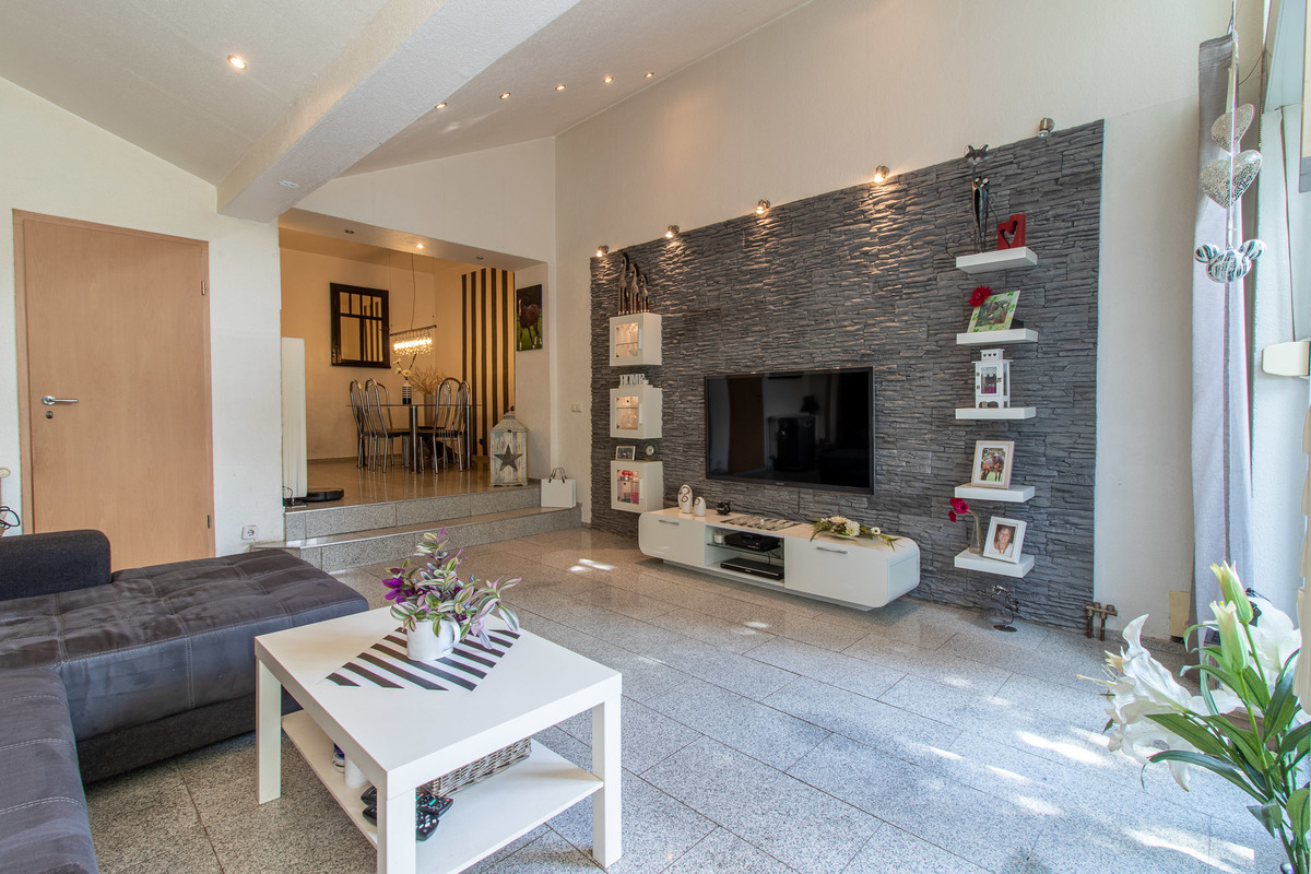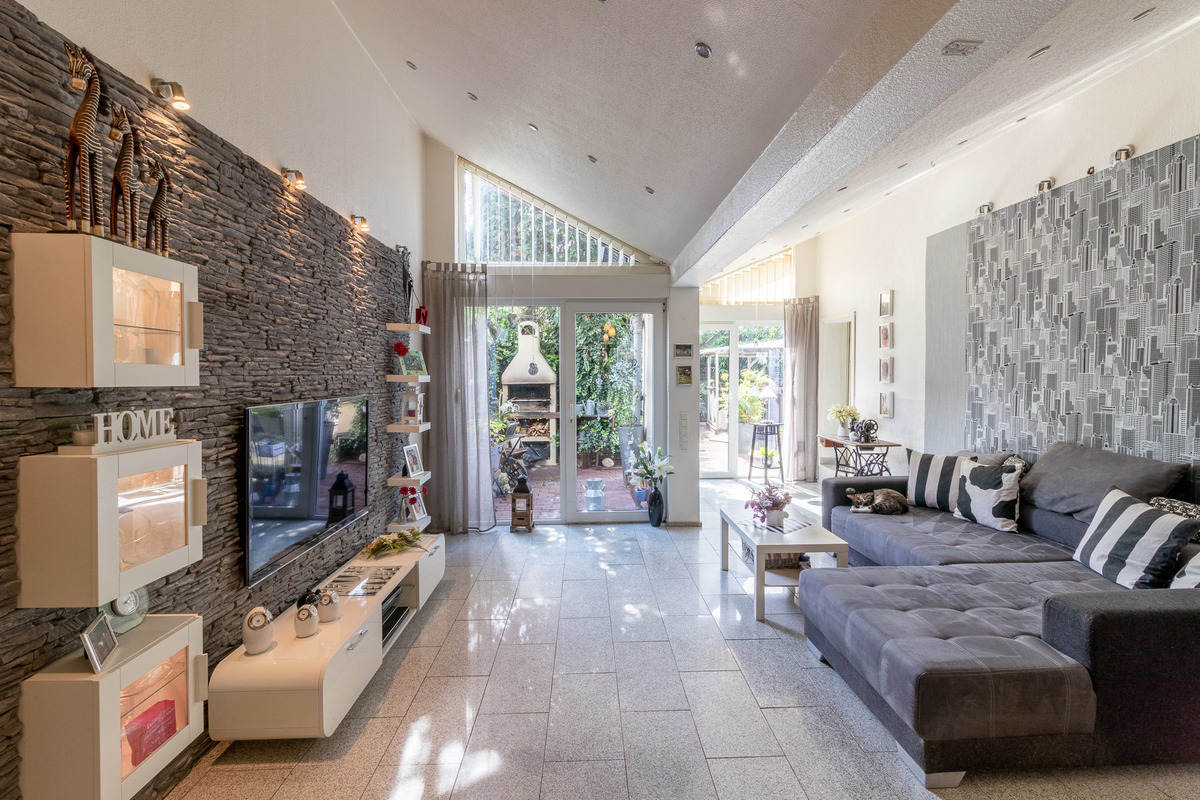 Im Erdgeschoss befindet sich der großzügige Wohn- und Essbreich der durch einen Anbau aus dem Jahre 2001 erweitert wurde. Durch die großen Fensterfronten haben Sie einen wunderschönen Blick auf die liebevoll angelegte Terrasse mit großem Sitzplatz. Ebenfalls auf dieser Ebene befindet sich ein Schlafzimmer, das Tageslichtbad sowie die separate Küche.