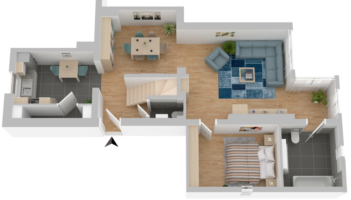 Über die Treppe im Erdgeschoss gelangen Sie in das Obergeschoss, welches über eine Küche und ein weiteres Schlafzimmer verfügt.