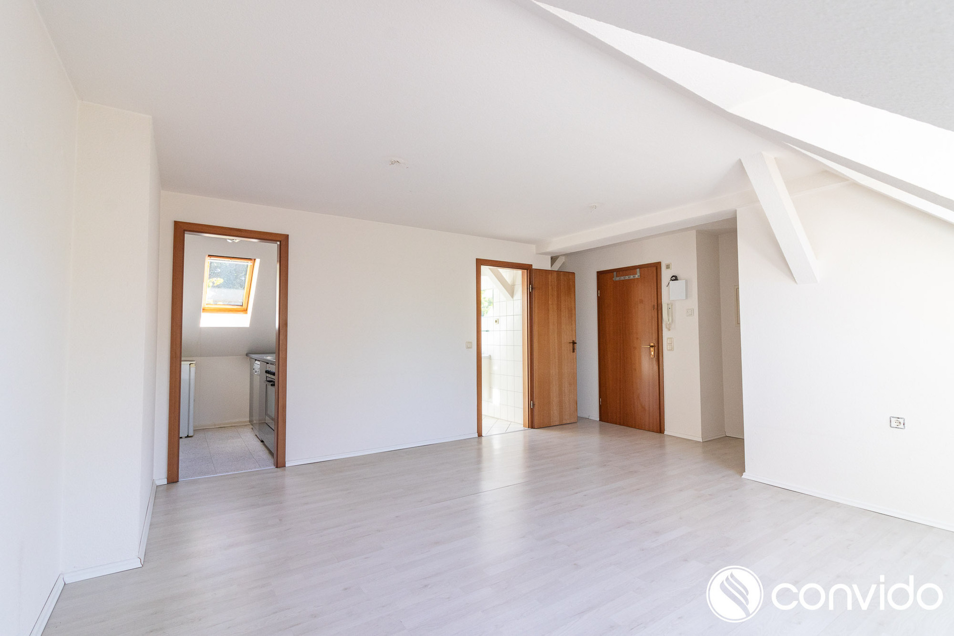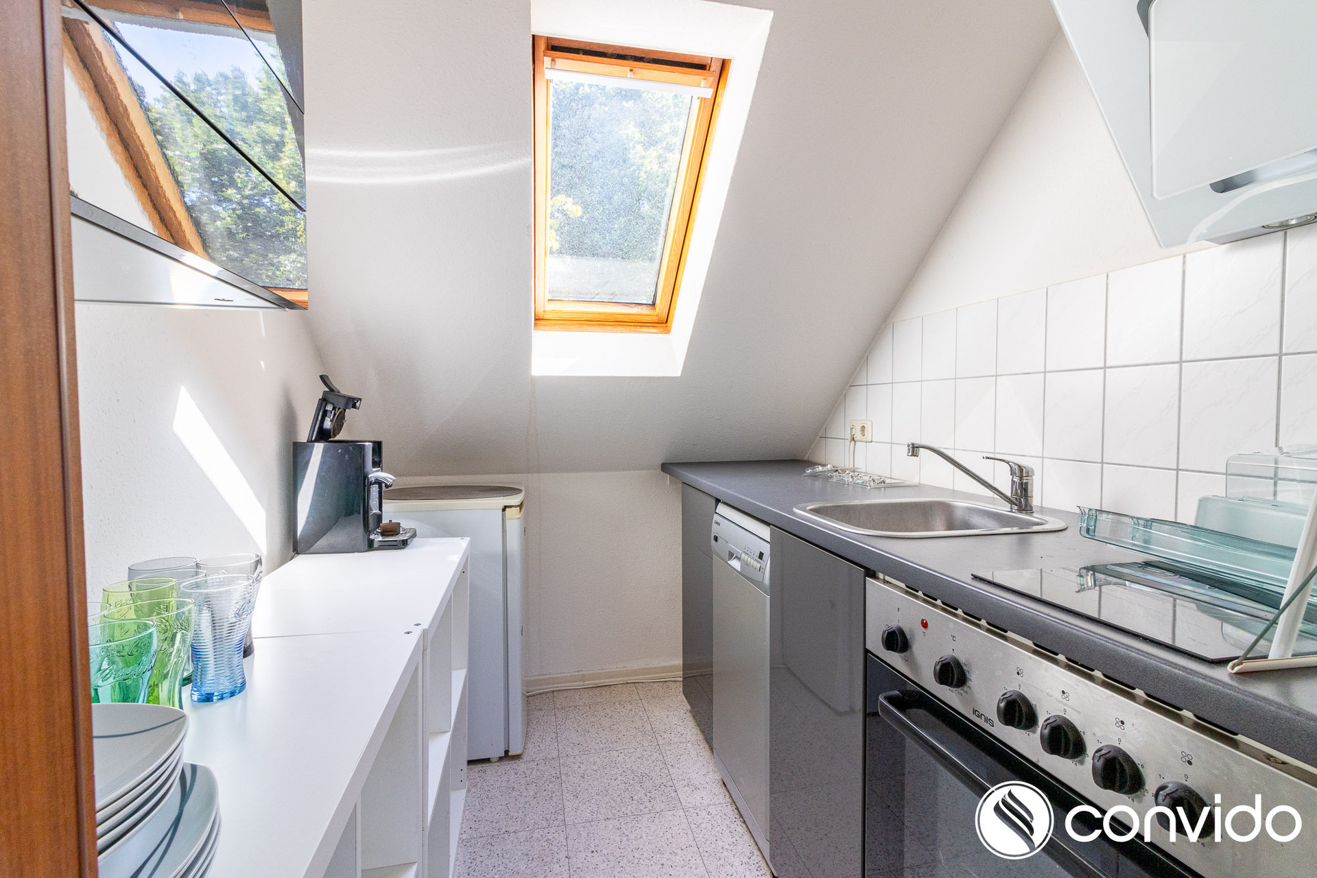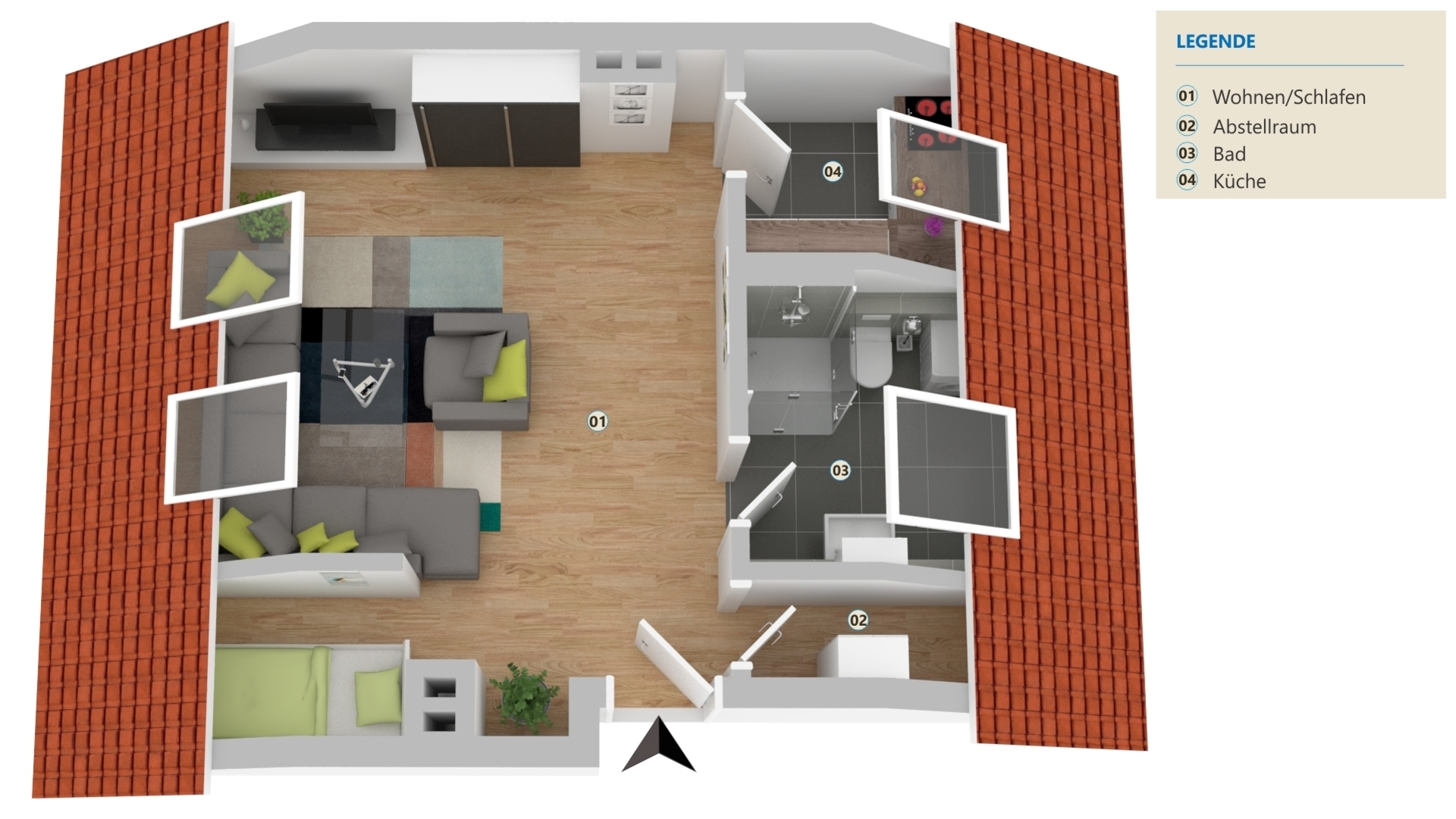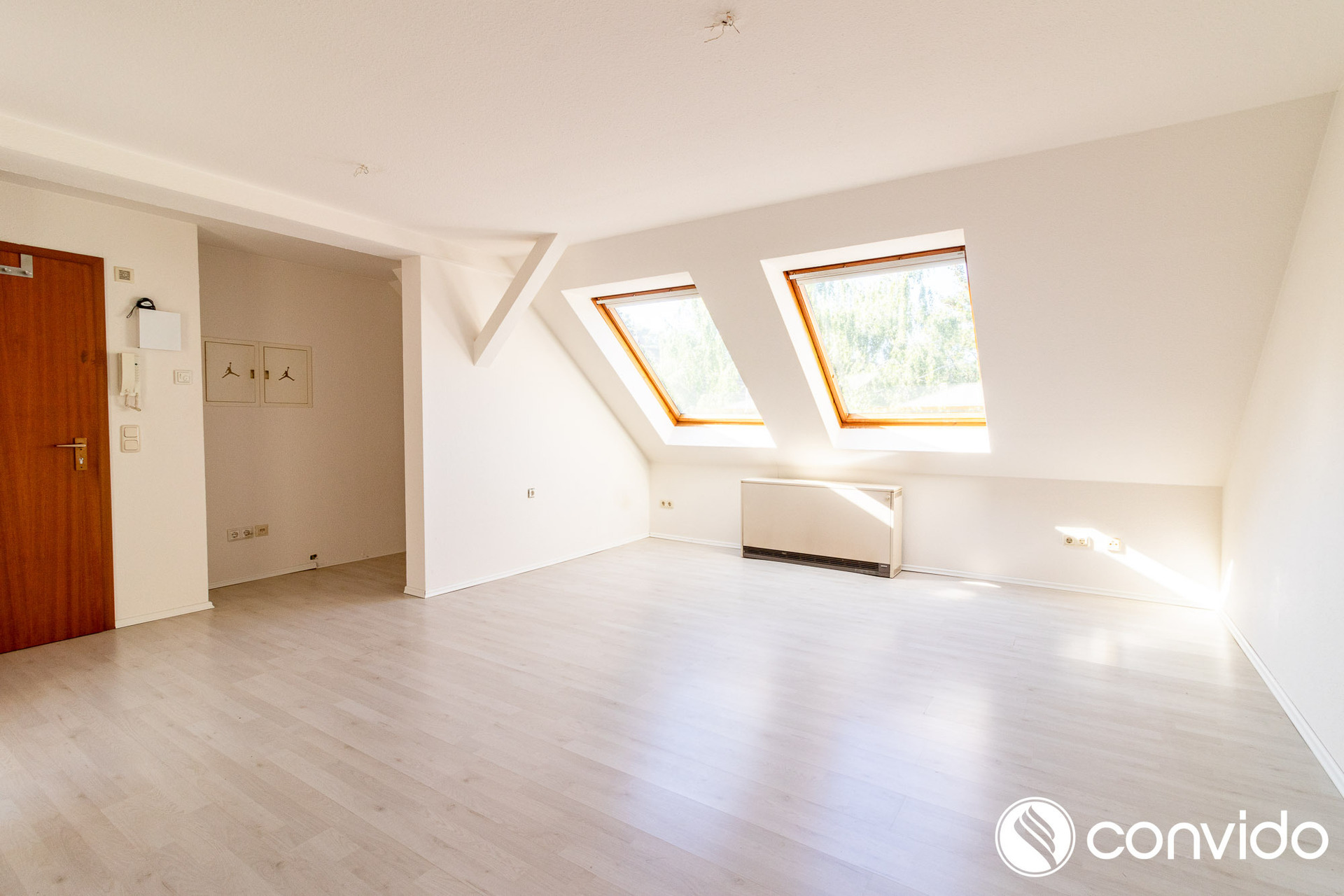Die Wohnung besteht aus einem Wohn-/Schlafzimmer, einer Küche und einem Badezimmer mit Dusche und Waschmaschinenanschluss. Durch die großen Dachfenster besteht eine helle und gemütliche Raumatmosphäre, wodurch unterschiedlichste Gestaltungsmöglichkeiten der Wohnung gegeben sind.