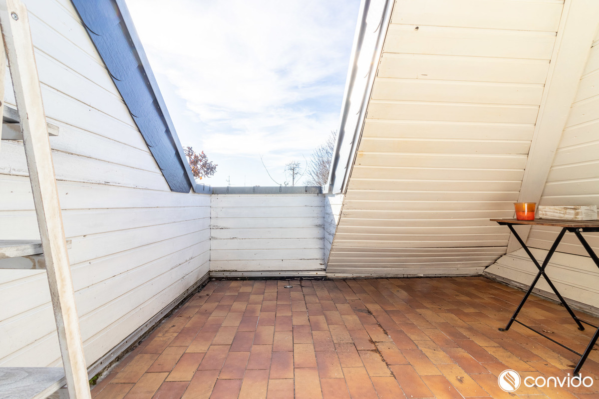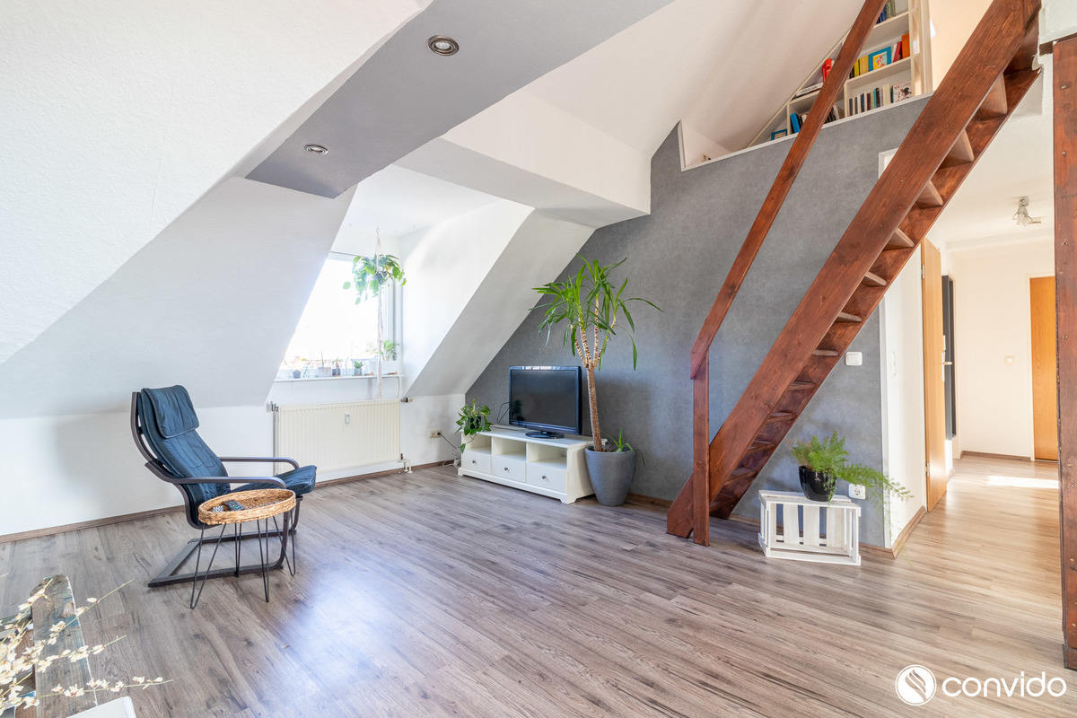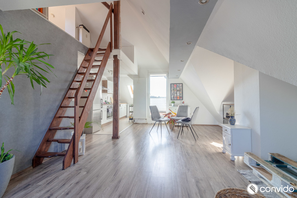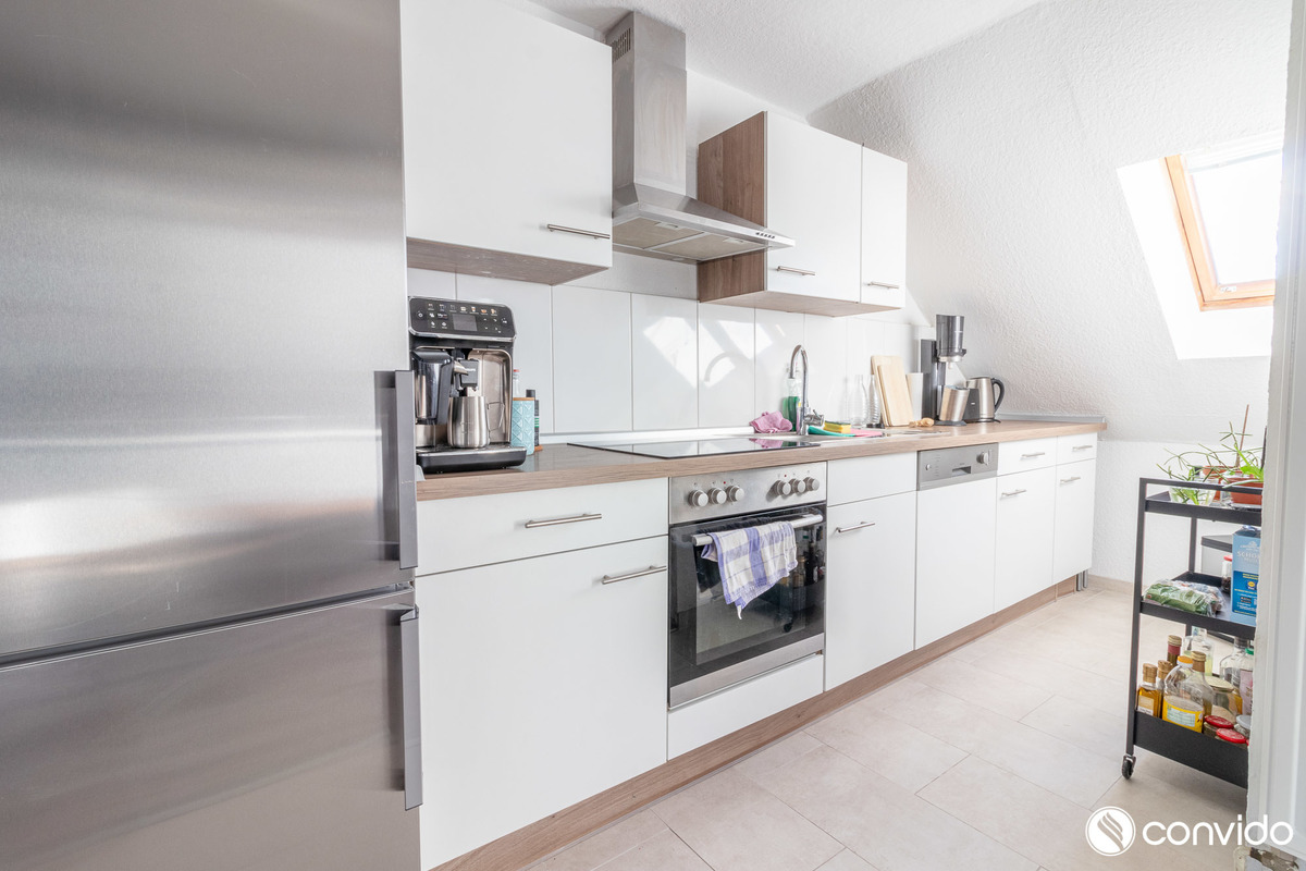 Auf einer Fläche von rund 74 m² erstrecken sich zwei Schlafzimmer, ein großzügiger Wohn-/Essbereich mit integrierter Küche, ein Bad sowie eine Abstellkammer. Die stimmige Offerte wird durch eine kleine Dachterrasse, deren Zugang am Ende des Esszimmers zu finden ist, abgerundet. Nach Betreten der Wohnung wartet zunächst ein Flur, der in alle Räumlichkeiten führt. Als gemütlicher Mittelpunkt hebt sich das Wohnzimmer hervor. Während eine große Fensterfront und der Außensitz ein freundliches Ambiente schaffen, werden Behaglichkeit und Komfort durch moderne Ausstattungsdetails bedient.