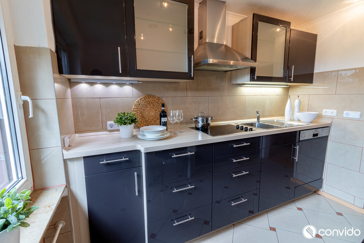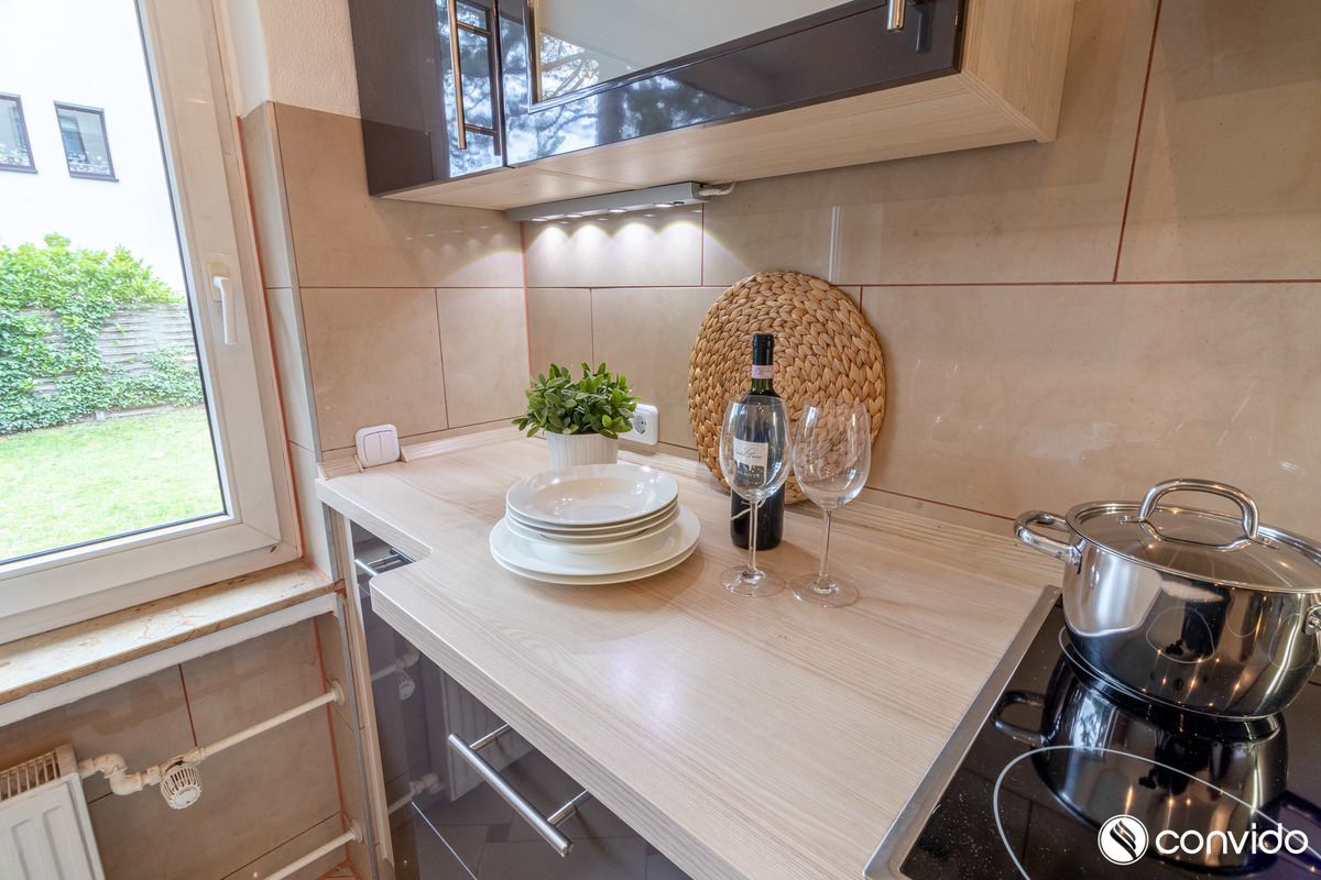 Im Kaufpreis inbegriffen ist eine hochwertige Einbauküche mit hochglanzpolierter Verkleidung. Der Wohnung sind eine elektrisch gesteuerte Einzelgarage und ein Kellerabteil zugehörig. Weitere Lagerfläche hält ein Abstellraum bereit.