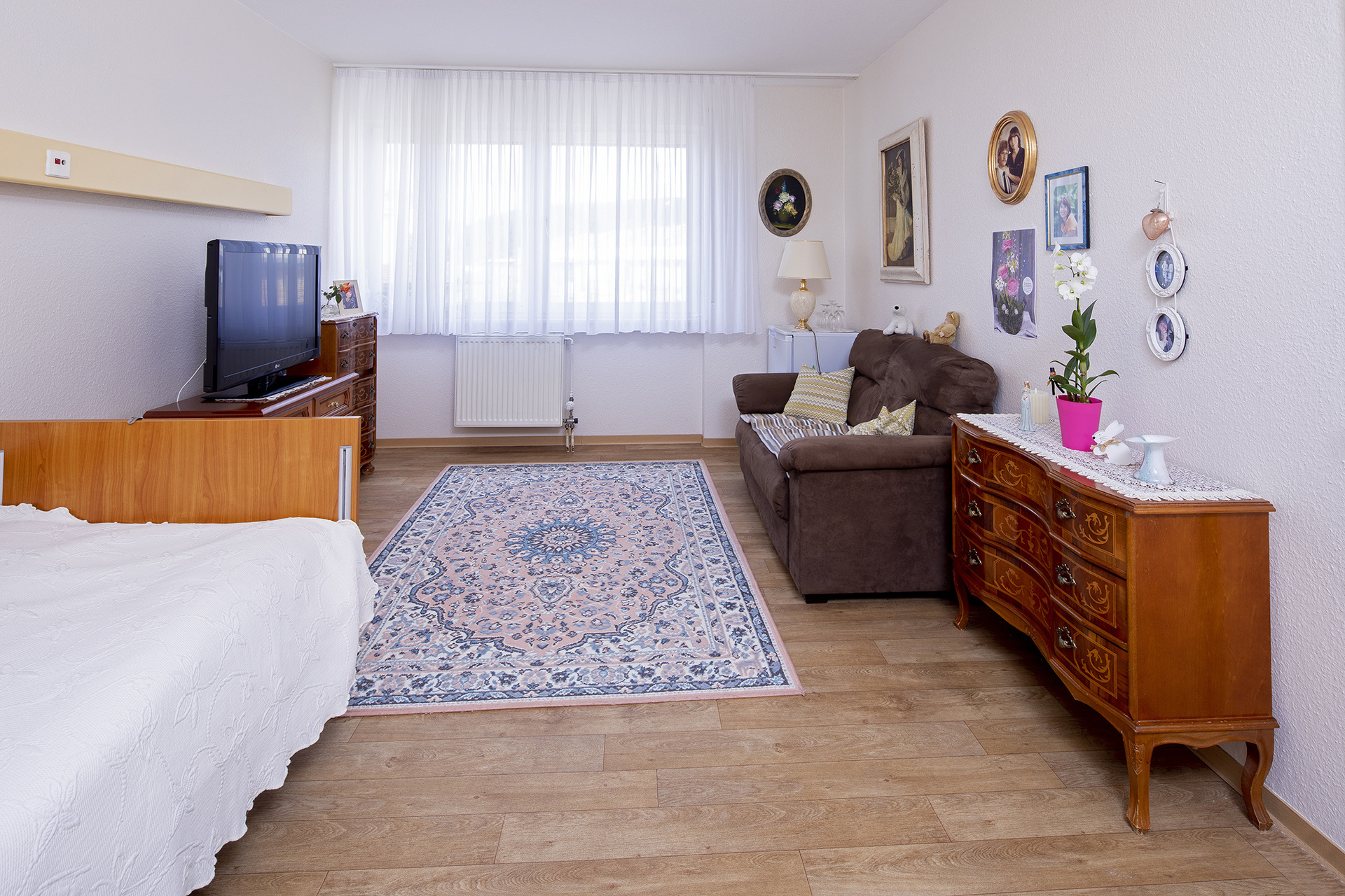 Die freundliche, helle und altersgerechte Wohnung verfügt über ein Zimmer mit eigenem Bad und einer Notrufanlage, damit sich die Bewohner in ihren eigenen vier Wänden wohl und sicher fühlen.