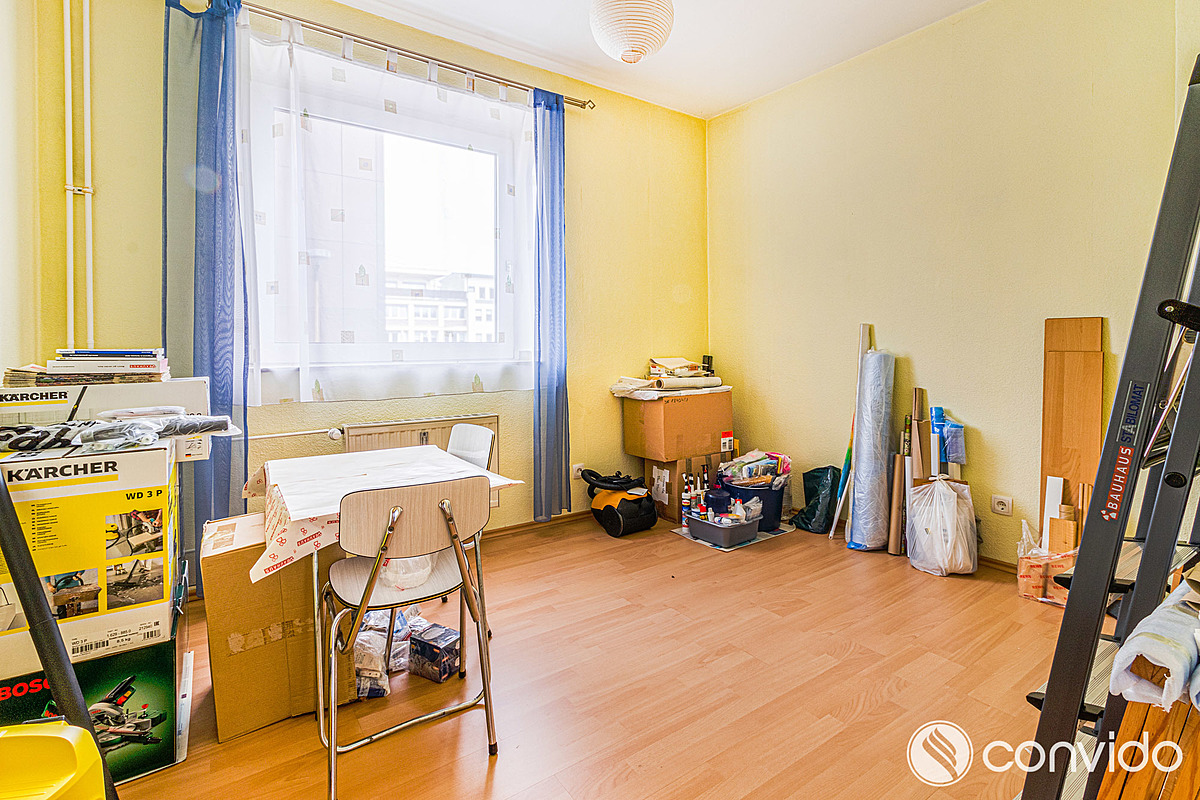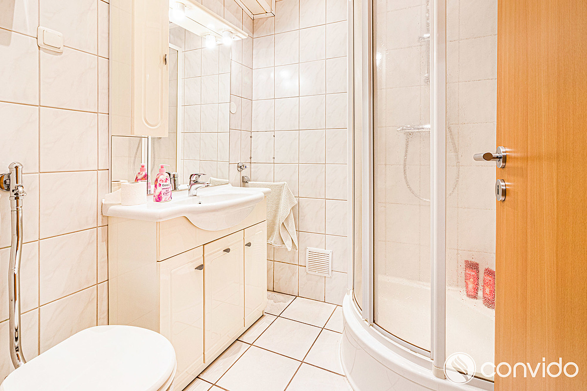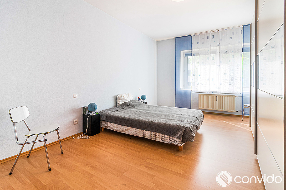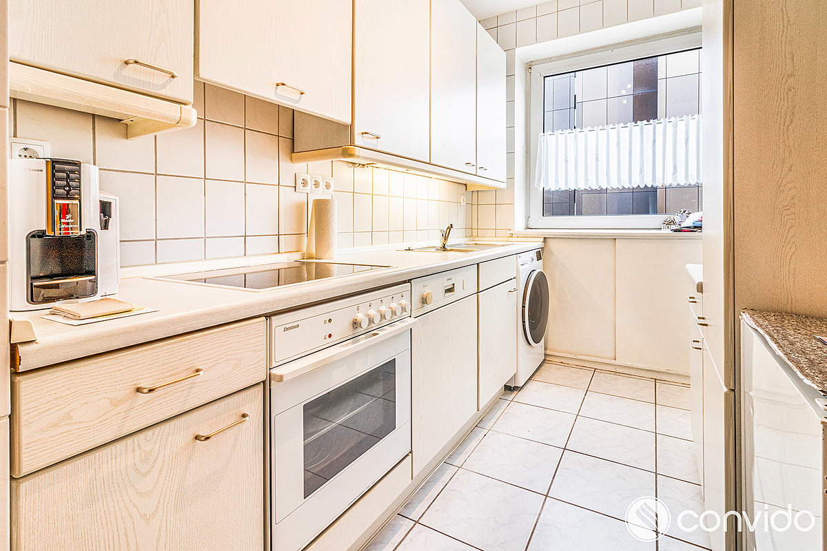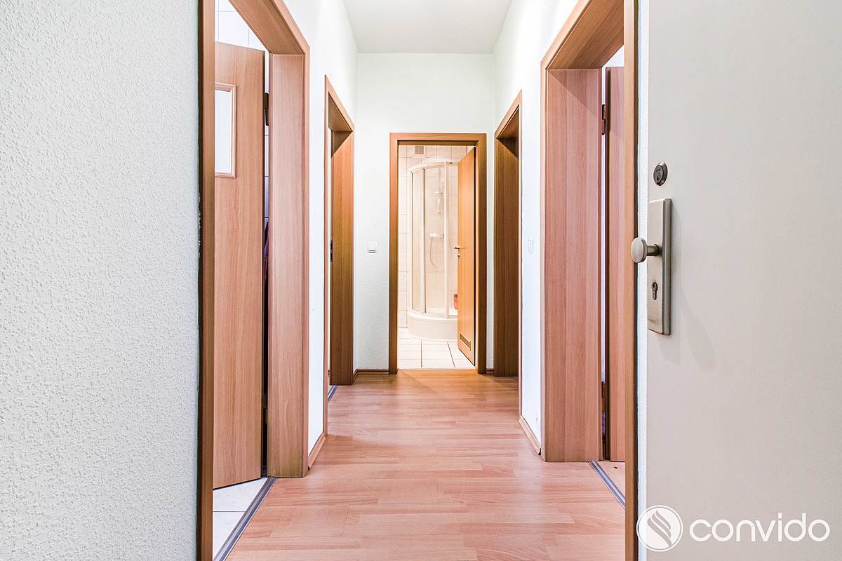 Auf einer Wohnfläche von ca. 63 m² erstrecken sich zwei Schlafzimmer, ein geräumiges Wohnzimmer, ein Badezimmer mit Dusche und eine Küche. Hier können die Möbel in der Küche übernommen werden.