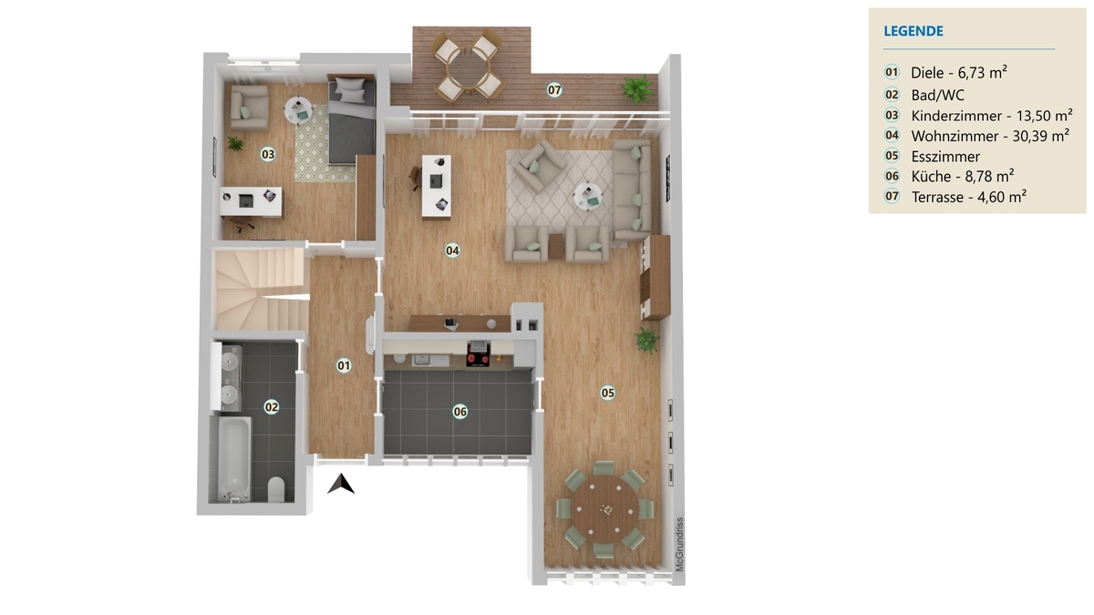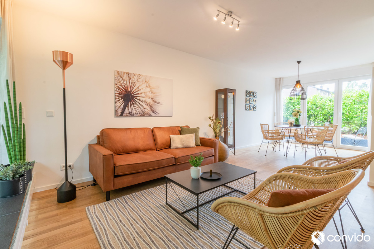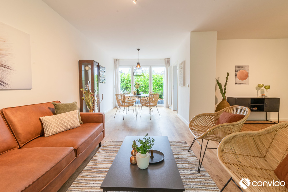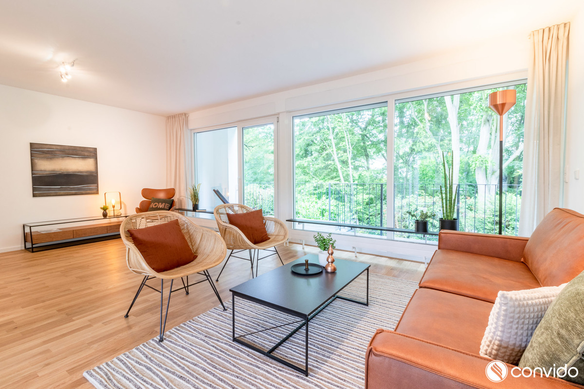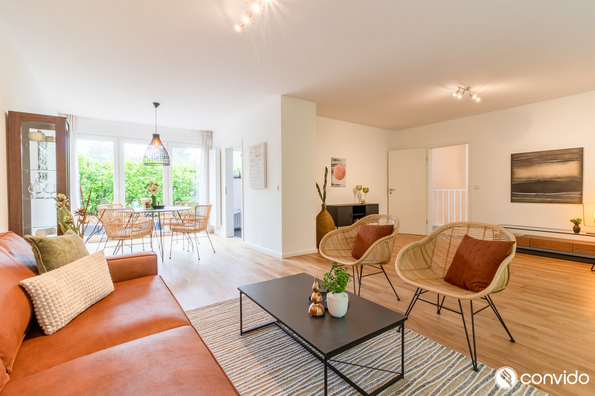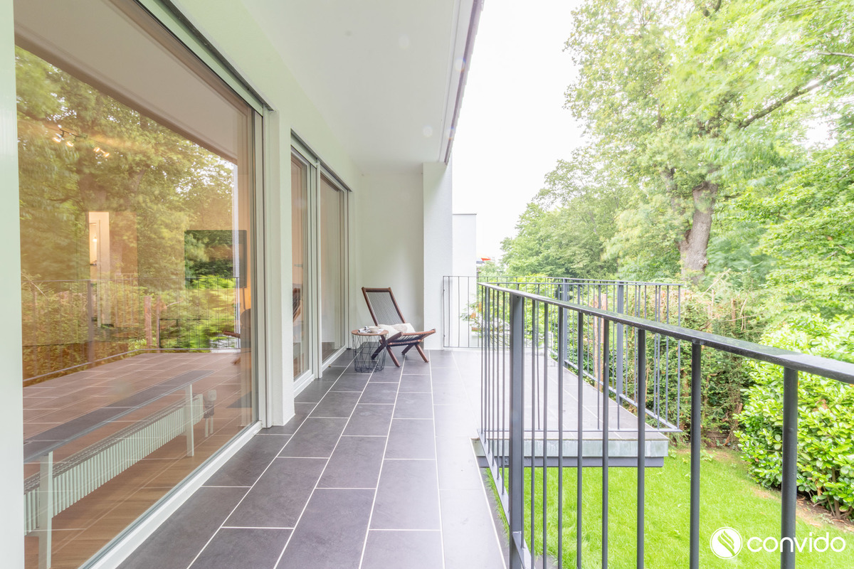 Entspannte Stunden im Freien können auf der einladenden Gartenterrasse oder dem Balkon der ersten Ebene verbracht werden.