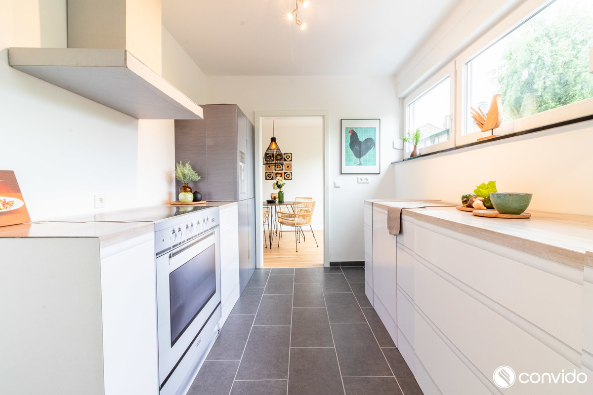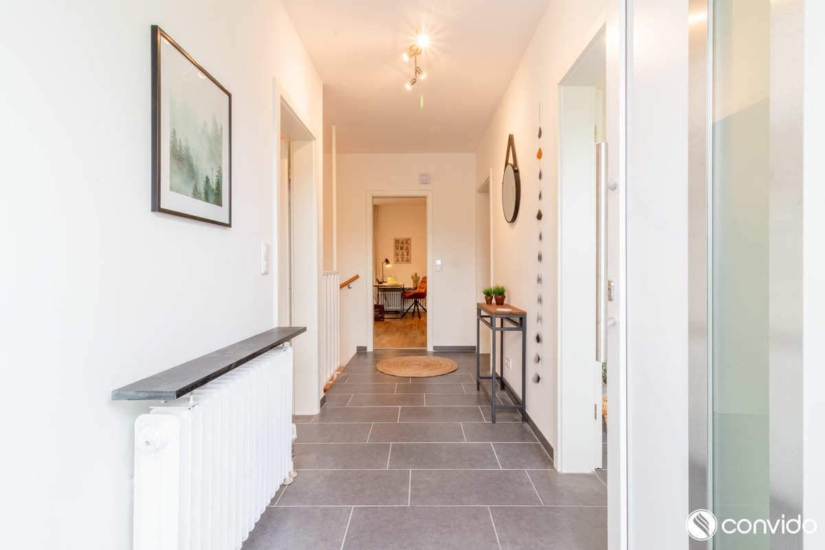 Verteilt auf zwei Ebenen und einer Wohnfläche von ca. 152 m² erstrecken sich fünf Zimmer, eine separate Küche, zwei Bäder mit Dusche und Wanne. Ein geräumiger Kellerraum bietet ausreichend Staumöglichkeiten. Im Erdgeschoss sind neben dem Hauptbadezimmer, der offene Wohn-/Esszimmer, die Küche und ein weiteres Zimmer anzutreffen.