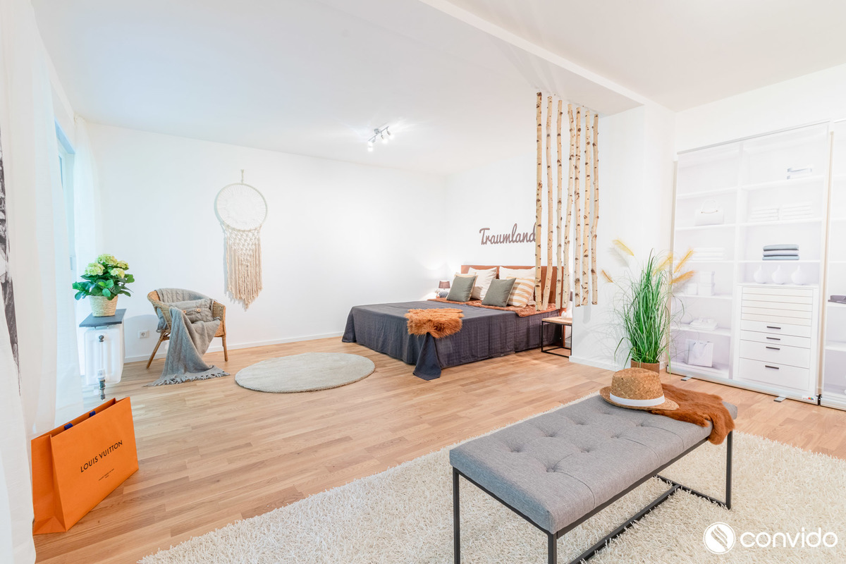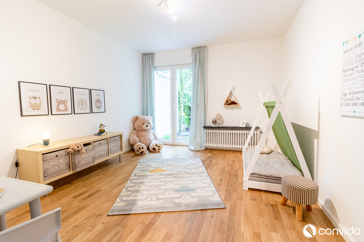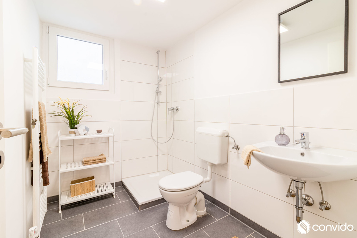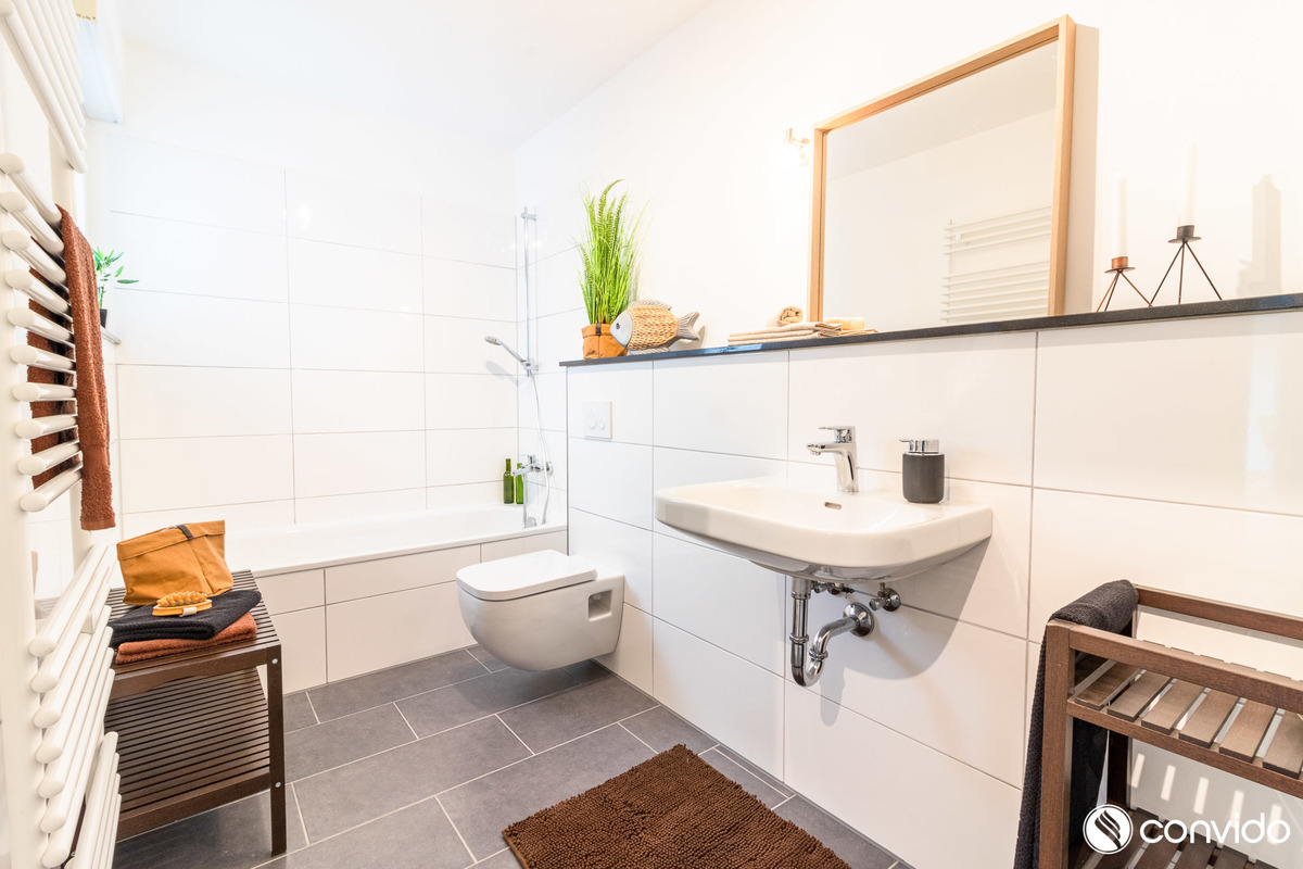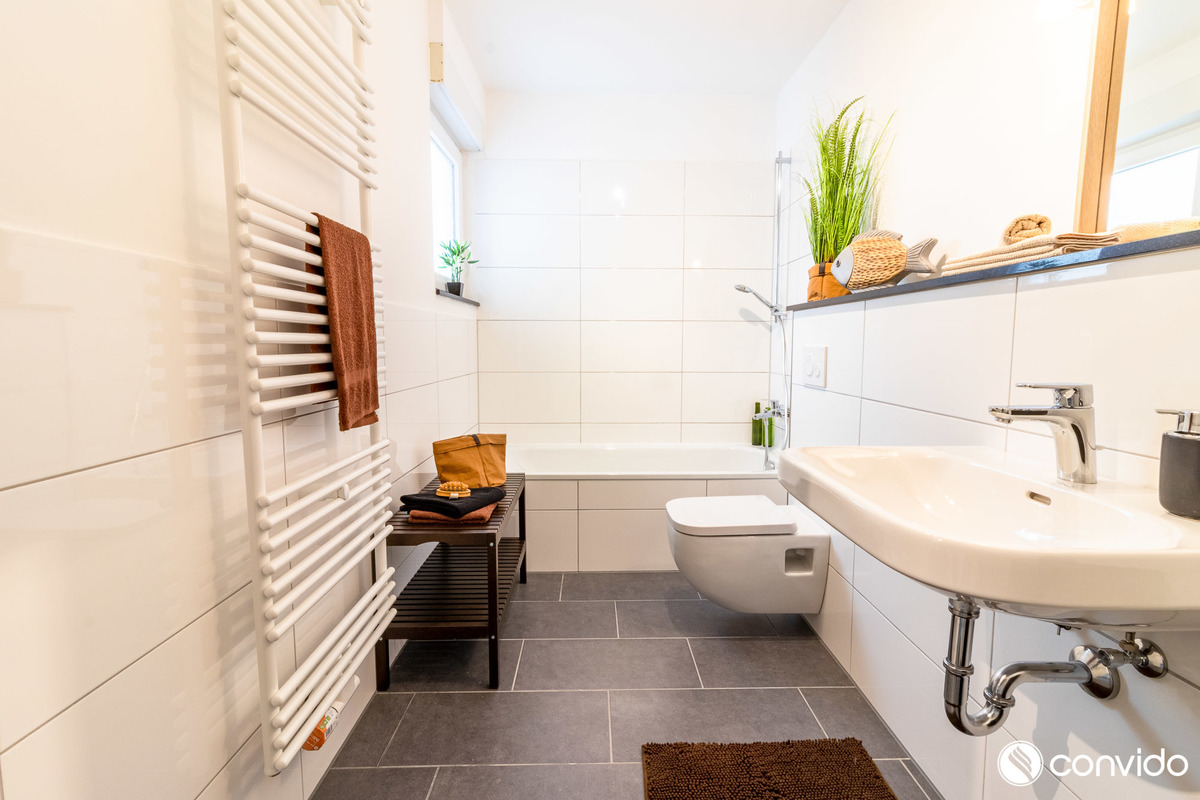 Die Schlafräume und das zweite Bad mit Dusche finden sich im Untergeschoss. Bedingt durch die Hanglage ist diese Etage nicht vollständig im Erdreich eingelassen, sodass auch hier hervorragende Lichtverhältnisse herrschen. Geschickt platzierte, große Fensterfronten und der gelungene Grundriss sorgen im gesamten Gebäude für ein freundliches Ambiente. Die notwendige Behaglichkeit wird in den Wohnräumen durch Echtholzparkett (Eiche) generiert. In der Küche wurden die Boden mit Anthrazitfarbene Fliesen ausgestattet. Diese modernen und zeitlosen Fliesen spiegeln sich in der Diele, Hauptbadezimmer und Badezimmer wieder.
