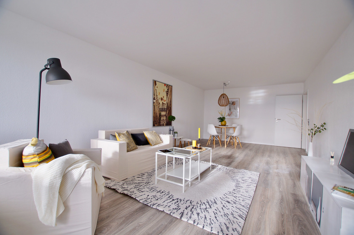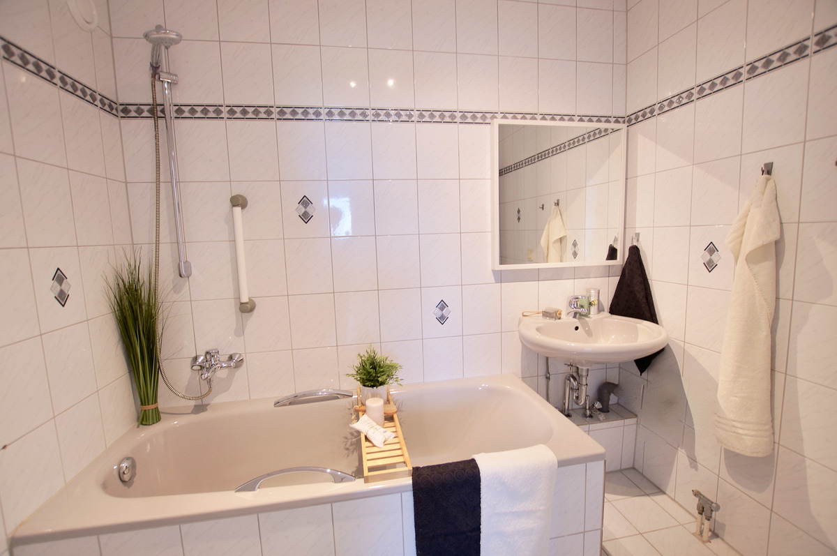Das zeitlose wannen Badezimmer bietet neben der Entspannung auch die Möglichkeit eine Waschmaschine/Trockner aufzustellen. Des weiteren verfügt die Wohnung über ein ebenfalls helles Gäste WC. In den Bädern sind zudem Haltevorrichtungen für zum Beispiel einen erleichternden Einstieg in die Badewanne vorinstaliert.